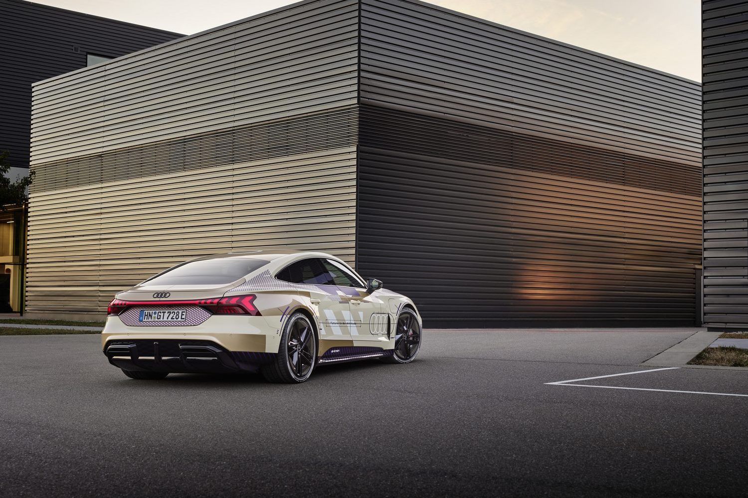 The colourful 'camouflage' wrap covering our test car doesn't seem to have a lot to do, as the sheet metal underneath appears barely changed. Compare this prototype with the current Audi RS e-tron GT and you'll spot that the 'bumper' panel below the headlights and bonnet - wrapping around the front of the car - has been restyled with less black material - though it's unclear if the 'grille' panel in the centre will remain body-colour.