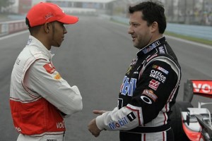 Two champions swapped cars when Lewis Hamilton handed over the keys to his F1 car to Tony Stewart and Hamilton climbed into Stewart's NASCAR racer.