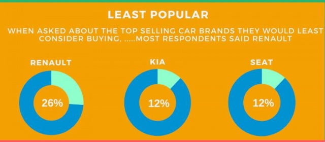 When asked why various brands were undesirable, four categories saw the following results: for poor reputation, Renault polled 65 per cent, SEAT 48 per cent and Skoda 45 per cent; for bad resale value, SEAT recorded 46 per cent, Kia 45 per cent and Skoda 39 per cent; for a bad personal experience, Ford was the worst with 41 per cent, followed by Opel (36 per cent) and Hyundai (28 per cent); and for unattractive styling, Nissan received the unwanted accolade of being ugly, according to 56 per cent of those surveyed, with Kia (47 per cent) and Skoda (44 per cent) close behind.