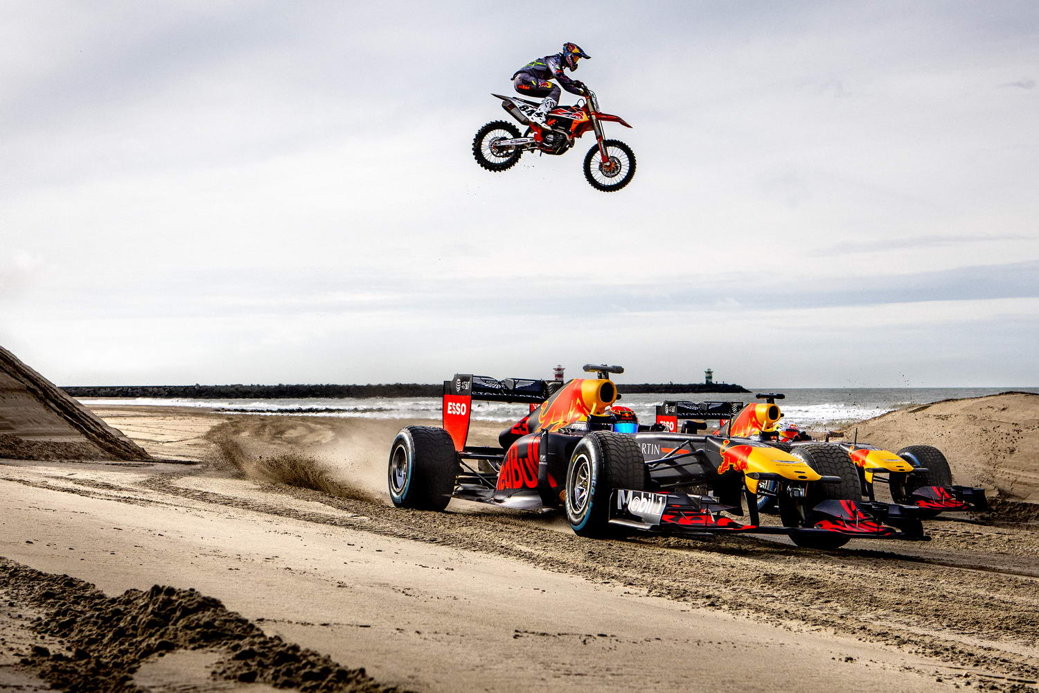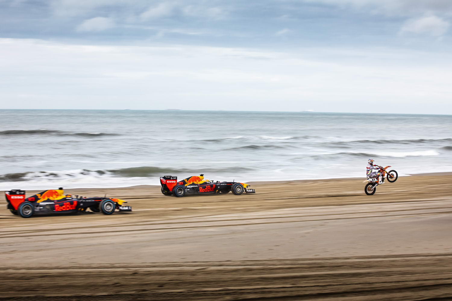 After the on-road driving session, there was time for a little off-roading, with Alex and Max taking the cars onto the beach at Scheveningen, along with fellow Red Bull star and motocross legend Jeffrey Herlings, who actually jumped his KTM bike over the two F1 cars.