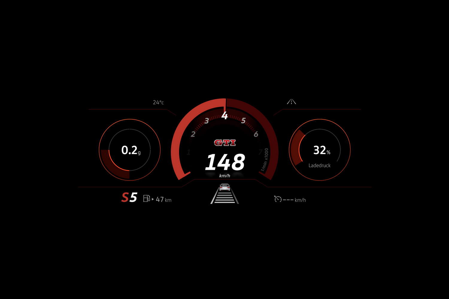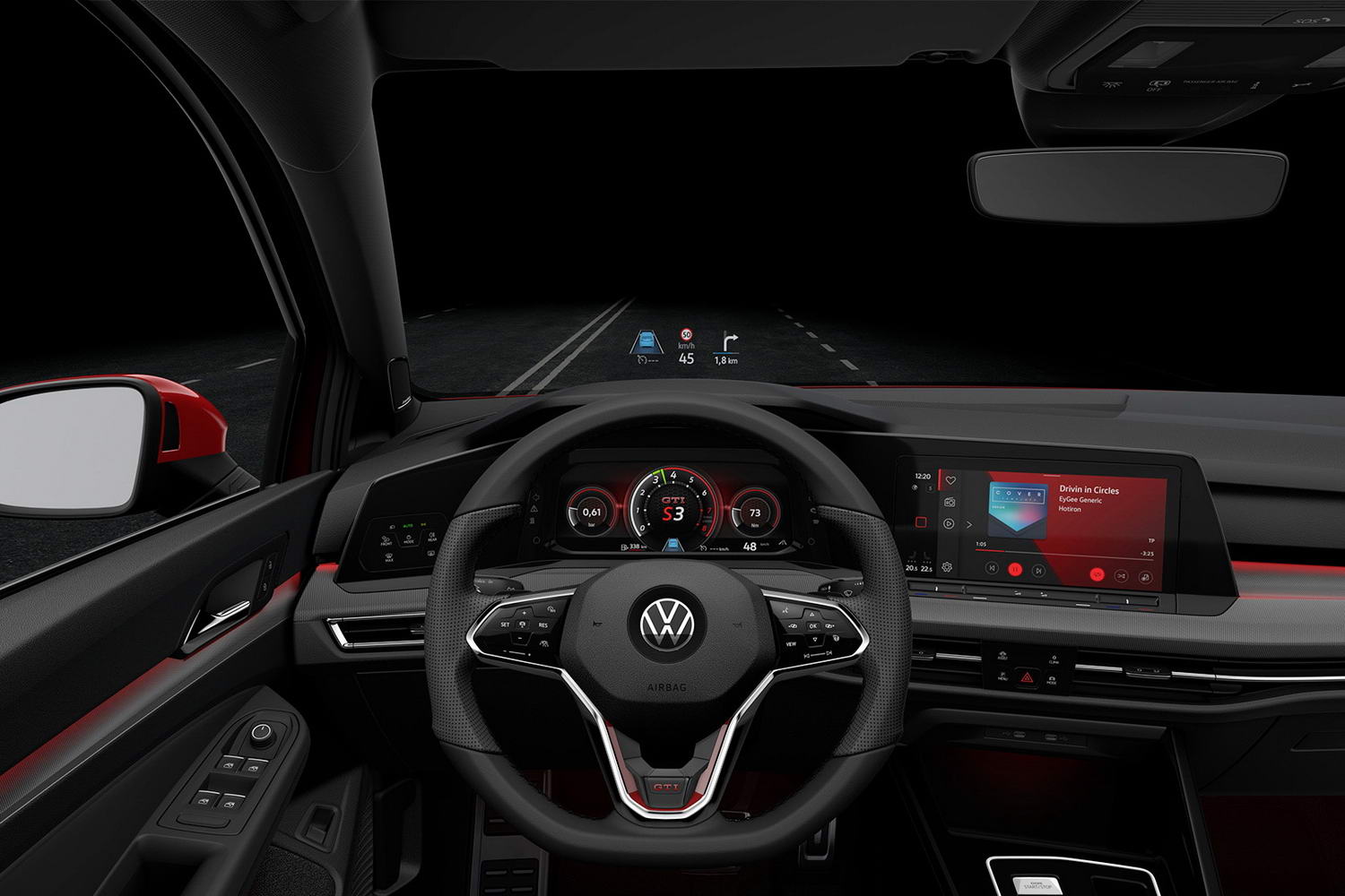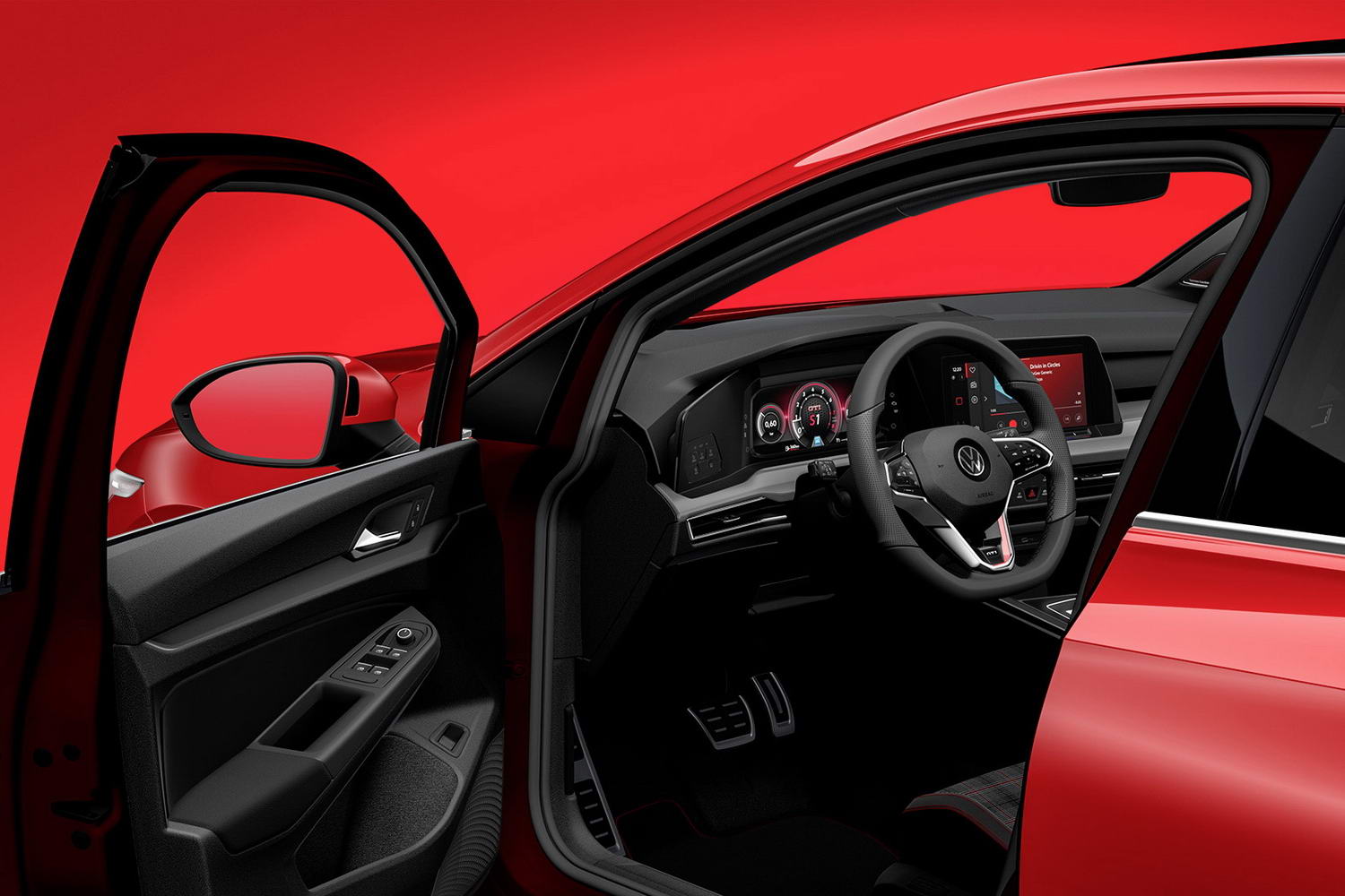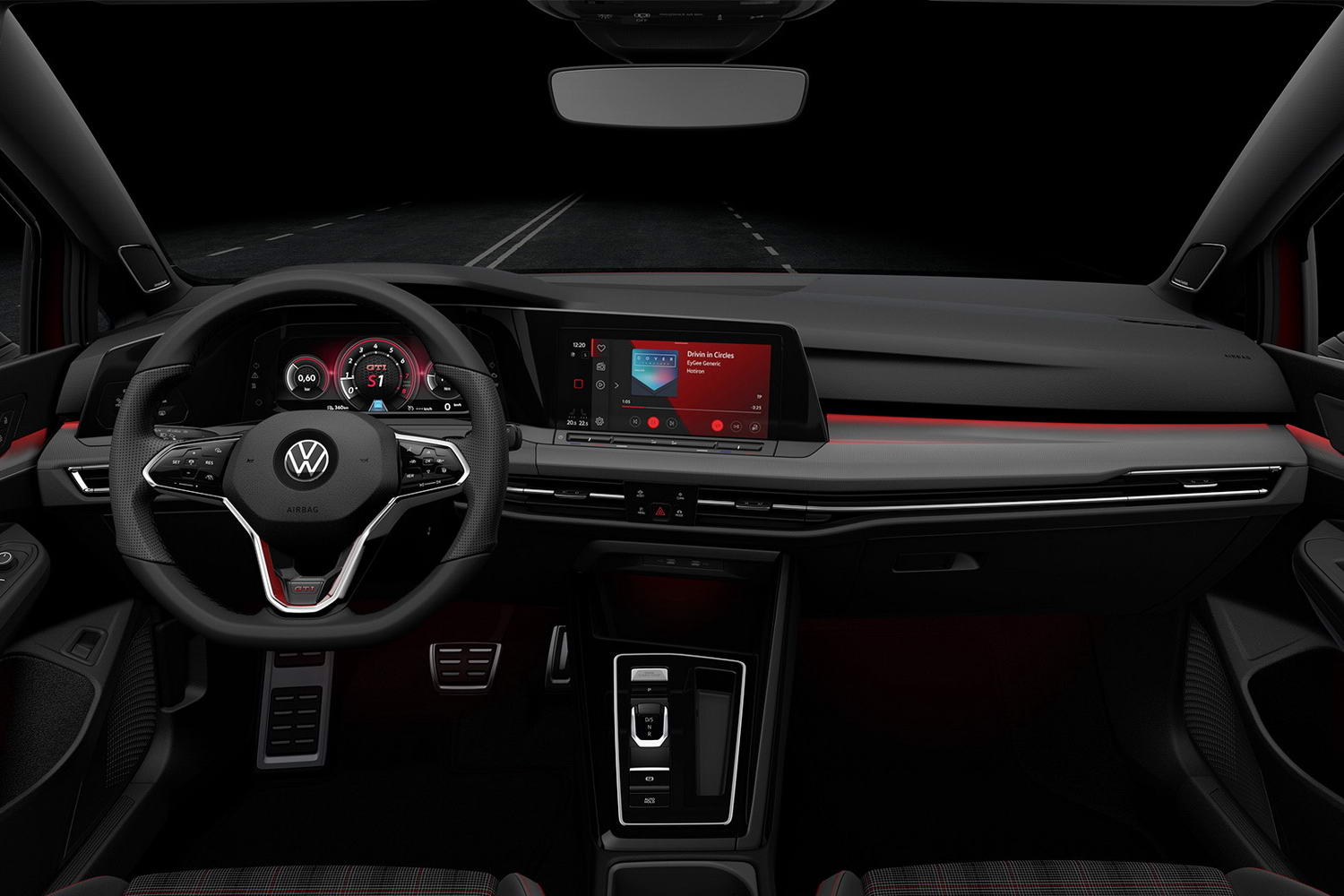 As you'd hope, the GTI's characteristic tartan-esque upholstery is present and correct (though many will choose to ignore it and upgrade to leather). It's a new design of pattern, called 'Scalepaper', while the GTI also gets new sports seats with integrated headrests. The honeycomb detail is found on the dashboard and doors. Speaking of which, if you open the driver's door, the new engine-start button will glow red until you start it up. There's more drama to be found, as the GTI comes with a unique view for the Golf's Digital Cockpit; it features a centrally positioned rev counter (and obligatory GTI logo) and then another round instrument rendered either side - the driver can customise what these display. And they can choose from 30 different ambient lighting colours, too.