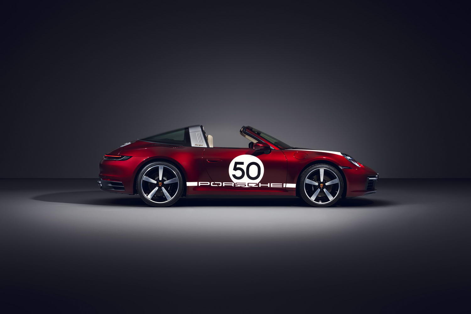 The 'hero' colour for the 911 Targa 4S Heritage Design edition is called Cherry Metallic red, echoing the style of the 1950s, according to Porsche (it cites three Porsche 356 red paint colours, another from the early 911 and the fact that its cars' manuals and other literature from the 1950s were produced in dark red and white). That colour contrasts with a silver Targa bar and gold-coloured logo. Indeed, gold is used on the model name script on the rear, too, while a special classic style of Porsche crest is used throughout the car.