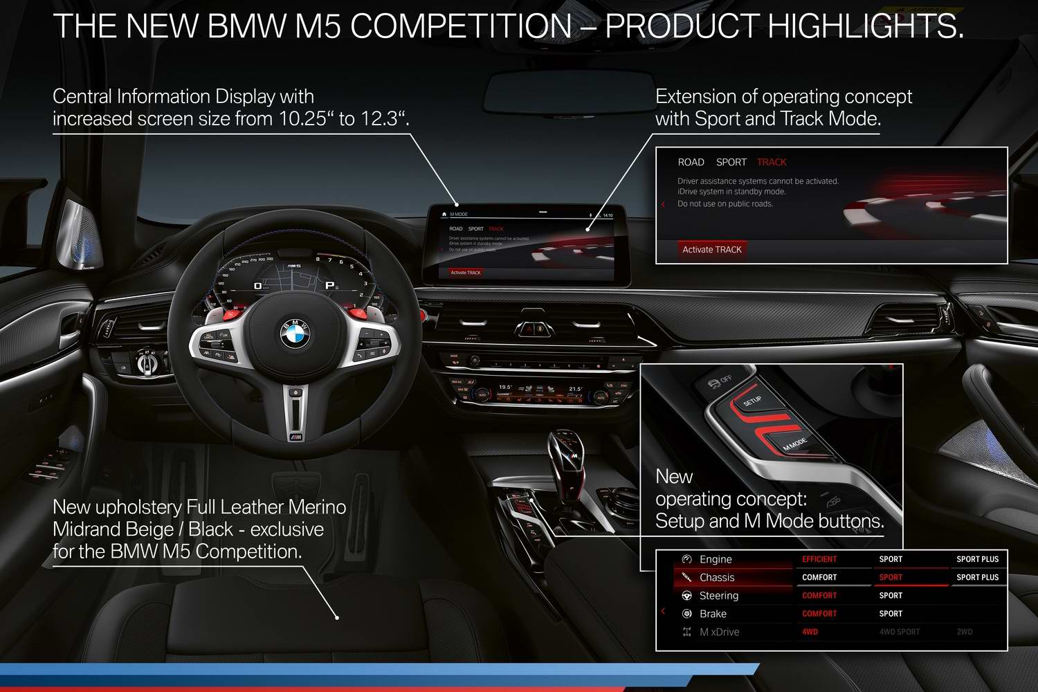 BMW didn't see fit to alter the mighty twin-turbocharged 4.4-litre V8 under the M5's bonnet. That means 625hp at 6,000rpm and 750Nm of torque produced from 1,800-5,860rpm. The 0-100km/h time is quoted as 3.3 seconds and top speed is limited to 250km/h, unless the buyer opts for the M Driver's Package, which ups it to 305km/h. Power is fed to all four wheels via an eight-speed M Steptronic automatic transmission with Drivelogic. The M xDrive system is rear-biased, even in the default 4WD setting, while the driver can switch it to 4WD Sport and even 2WD, which means all power to the rear wheels only. An electronically controlled limited slip differential is fitted to the rear axle.