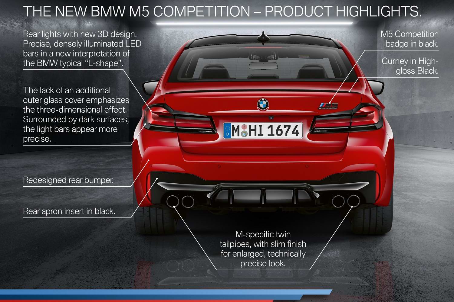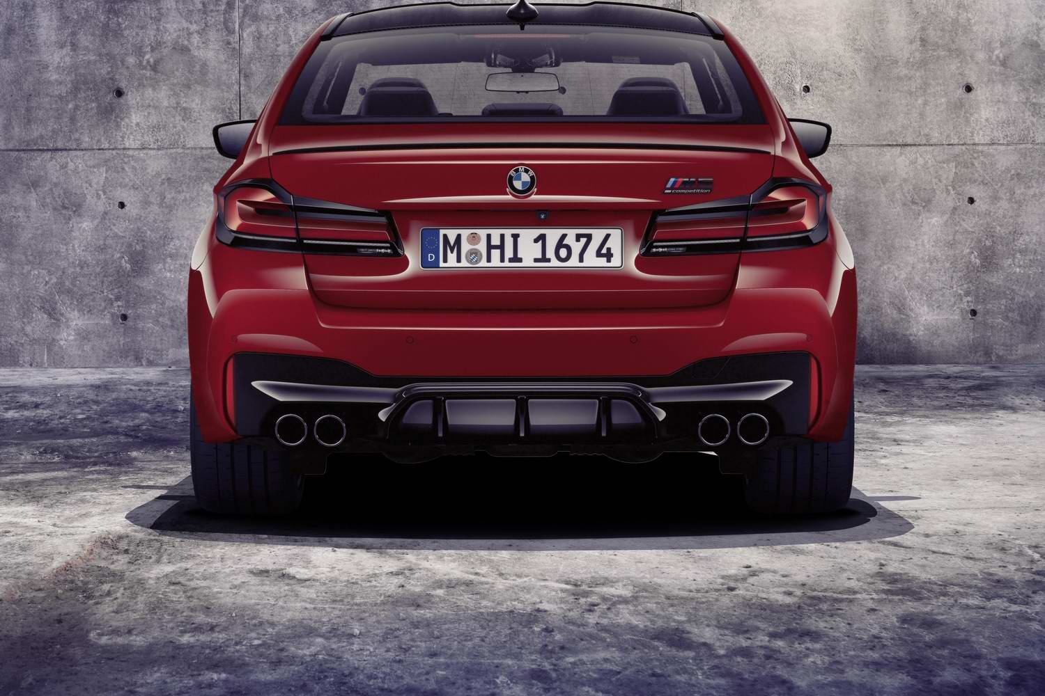 Naturally, as this is a new BMW, it gets a larger grille than before. It's more upright, wider and deeper than that of the outgoing M5 Competition, though it keeps its moody black surround and vertical bars. The front bumper and lights are new, as well. A high-gloss black finish is applied to the mesh on the M 'gills' aft of the front wheels, the door mirrors and the subtle boot spoiler at the back. The new rear bumper has a black insert, as well, while the restyled quad exhaust system outlets are in Black Chrome.