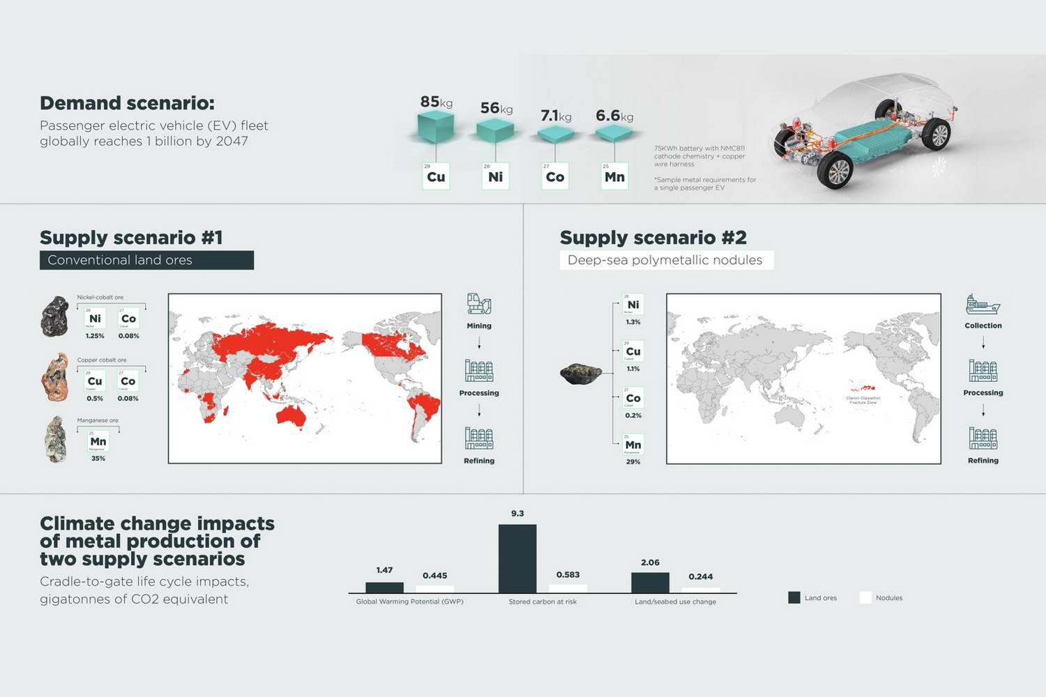 "What happens to carbon sinks on land and on the seafloor used for metal production is another big part of the climate impact story," said Dr Steven Katona, marine biologist and co-founder of the Ocean Health Index who contributed to the study. "On land, carbon is stored in vegetation, soil and detritus. On the seafloor, carbon is stored in sediments and seawater. Producing metals for one billion EVs from land ores would disrupt 156,000 km2 of land and 2,100 km2 of seabed for deep-sea tailings disposal. Producing the same amount from nodules would disrupt 508,000 km2 of the seafloor during nodule collection and 9,800 km2 of land during metallurgical processing. Despite disturbing a larger area of the seafloor, metal production from nodules would cause much less carbon disruption. This is because seafloor sediments store 15 times less carbon per km2 than an average terrestrial biome and there is no known mechanism for disturbed seafloor sediment to rise to the surface and impact atmospheric carbon. In contrast, mining on land requires removal of forests, other vegetation and topsoil to access the ore, store waste and build infrastructure. In the process, we lose stored carbon and disrupt carbon sequestration services for as long as land remains in use, which can be as long as 30-100 years."