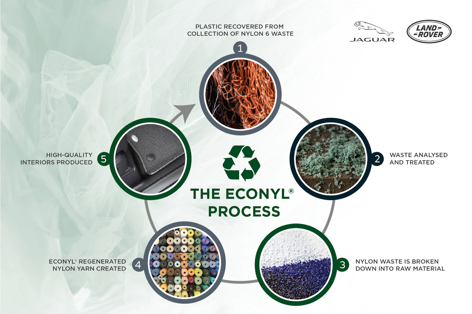 Jaguar Land Rover (JLR) says that its next-generation vehicle interiors will seriously ramp up its use of recycled materials. The car maker is working with recycled materials firm Aquafil to create high-quality interior materials using both seaborne and landfill waste.