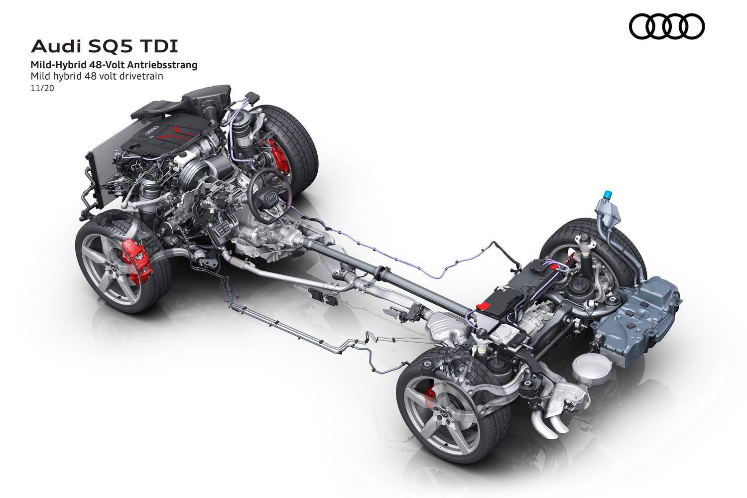 But there's a lot going on here mechanically, as Audi has taken great steps to make the V6 TDI ever more efficient. Its pistons are now made of forged steel, rather than aluminium, which doesn't incur a weight penalty but which allows for faster and more efficient fuel combustion. There's a new piezo sensor in the solenoid injectors of the fuelling system, while the SQ5's intercooler has been switched from its previous air-to-air unit mounted in the bumper, to a revised indirect water-to-air 'cooler in the inside of the V of the engine. As this results in a shorter intake path, turbo boost should build up more quickly, minimising any lag. Even the turbo itself has a smaller and lighter compressor to let it spool up to full operating speeds as rapidly as is possible, and as if all of that wasn't enough then know that the exhaust manifold has increased insulation and the SQ5 now has a 48-volt mild-hybrid electrical system, making it an MHEV - this runs, among other things, an electrically powered compressor (EPC), another lag-reducing item which was first seen on the SQ7. Expect the MHEV tech to salvage 0.7 litres/100km of additional diesel on the SQ5.