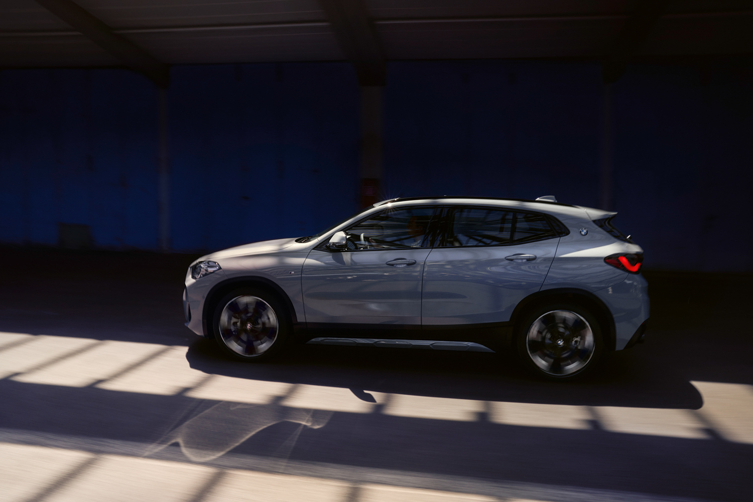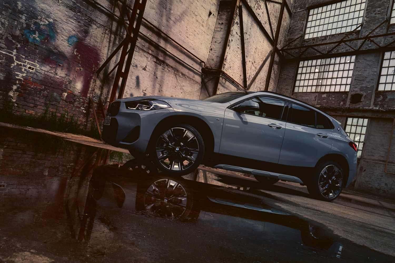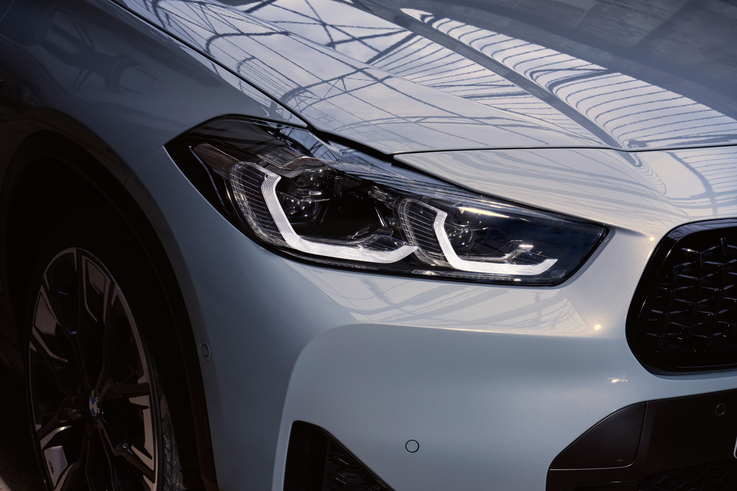 The BMW Individual High-gloss Shadow Line comes as standard, so all of the exterior chrome is excised in favour of glossy black trim. The door mirrors come with puddle-light projectors, which shine an X2 logo onto the ground when the door is unlocked or opened at night.