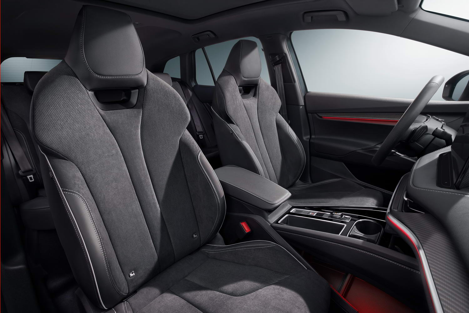 Meanwhile, the rear window surround and part of the rear spoiler is black, as is the Skoda lettering and other badges on the tailgate. Further enhancing the sporty exterior look, the Enyaq Sportline iV gets its front suspension lowered by 15mm and rear suspension lowered by 10mm.