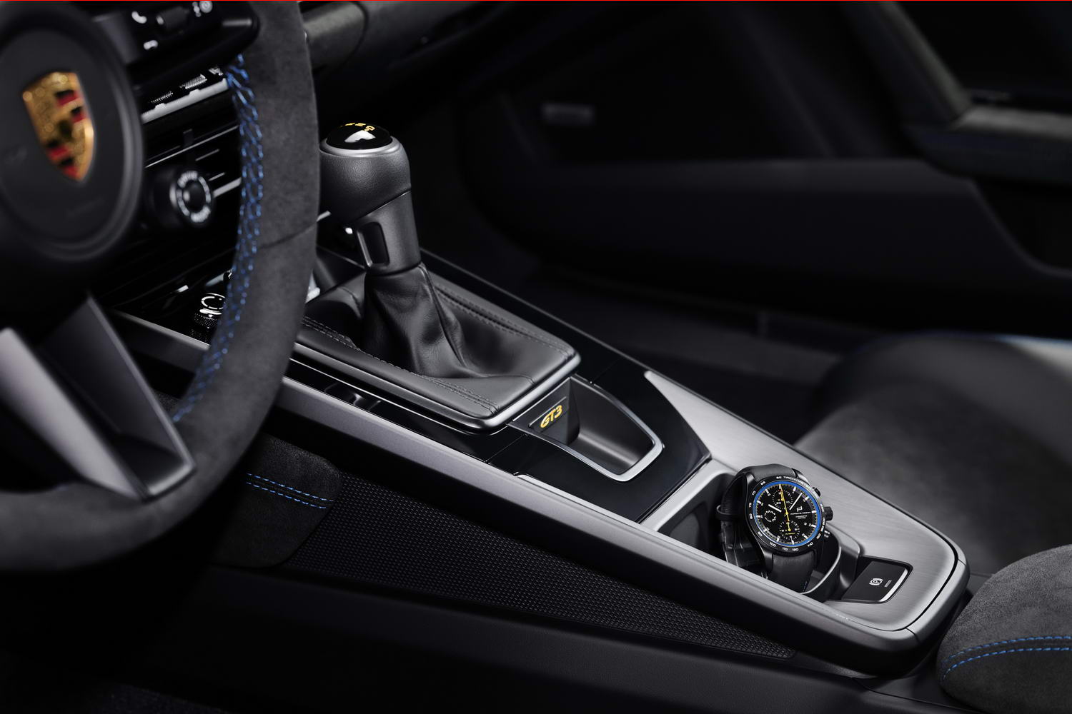 For this generation of GT3, Porsche is responding to customer demand by offering more individualisation options from the Exclusive Manufaktur range. These include a lightweight roof made of exposed carbon fibre, door mirror tops also rendered in carbon, darkened LED Matrix main headlights and matching Exclusive Design rear lights that reduce the red on display when they're not illuminated. Any model with black alloy wheels can have a pinstripe around the rim of the alloys in either Guards Red or Shark Blue. Inside, the rev counter, the Sport Chrono dash-top stopwatch, the seatbelts and the trim strips can all be finished in the same colour as the body, or in another shade of the owner's choice. There's even a matching watch, or 'individual chronograph', that Porsche Design will offer exclusively to purchasers of the 992 GT3.