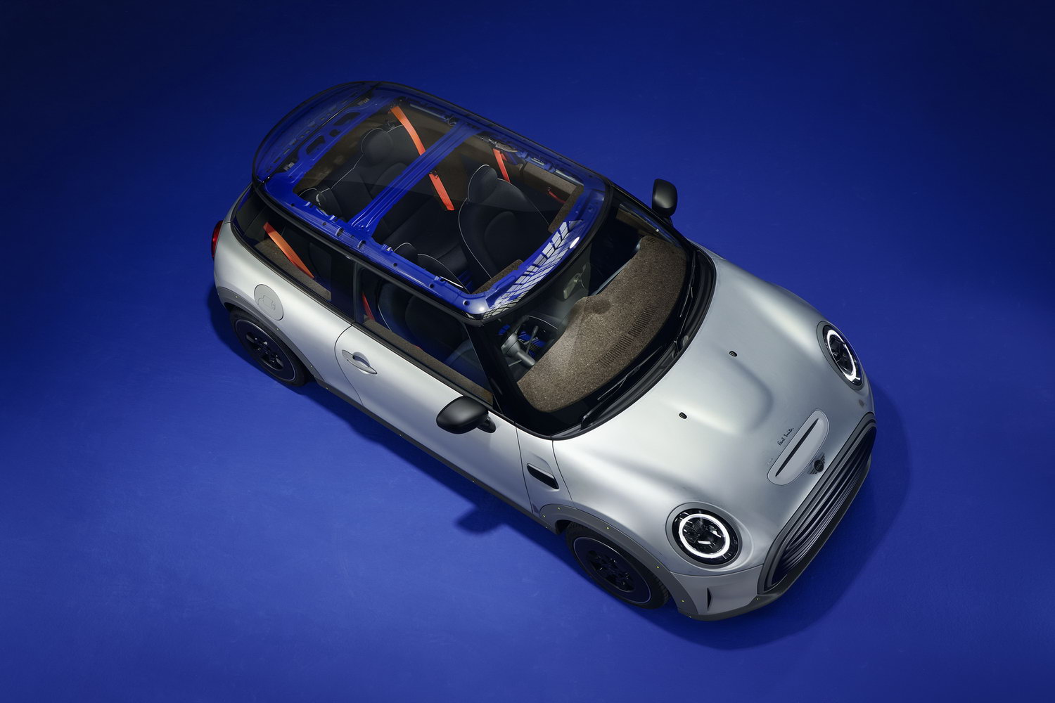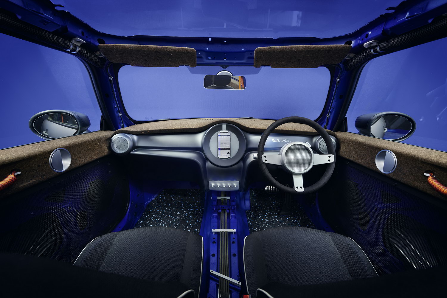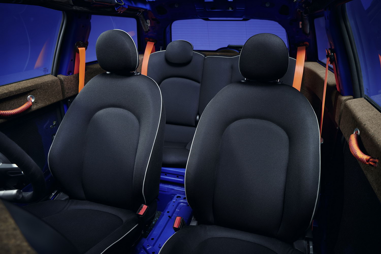 Inside, the standard Cooper SE's interior has been stripped back to just the dashboard, topper and parcel shelf, and all leather and chrome elements have been removed. The car's metal shell is painted metallic blue and is a focal point of the cabin, with the aim being to make it feel bare but 'dressed' at the same time.