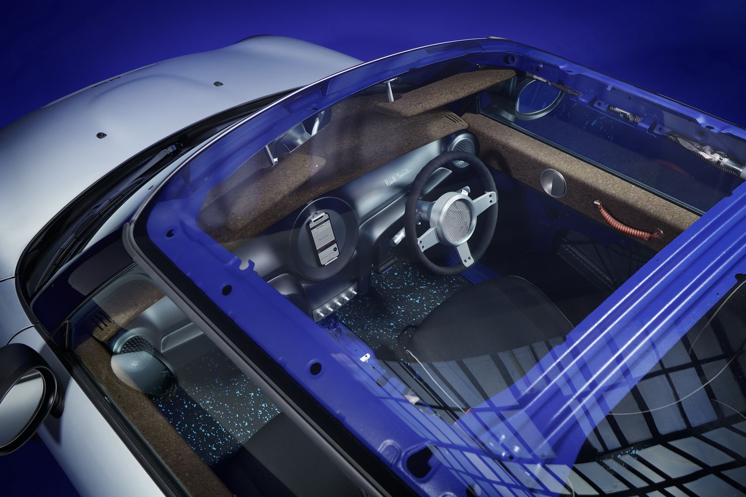 A blank grille and smooth wheel trims have been added to increase the electric car's range, all of which are made from recycled Perspex. The same material is used for the roof, although here it's clear to reveal the bare bodyshell. The car's charging flap has a plug logo designed by Smith, while the port behind the flap is coloured neon green.