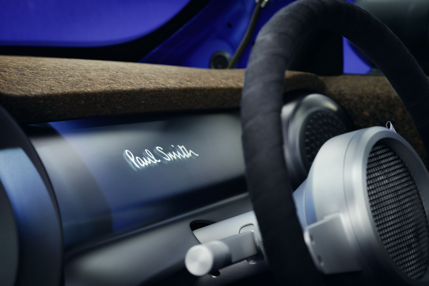 The dashboard gets a smoked glass insert with Paul Smith logo included, while the standard MINI's central display is replaced by a panel blank. Instead, the driver's smartphone is placed there, and this takes over as the car's infotainment centre.