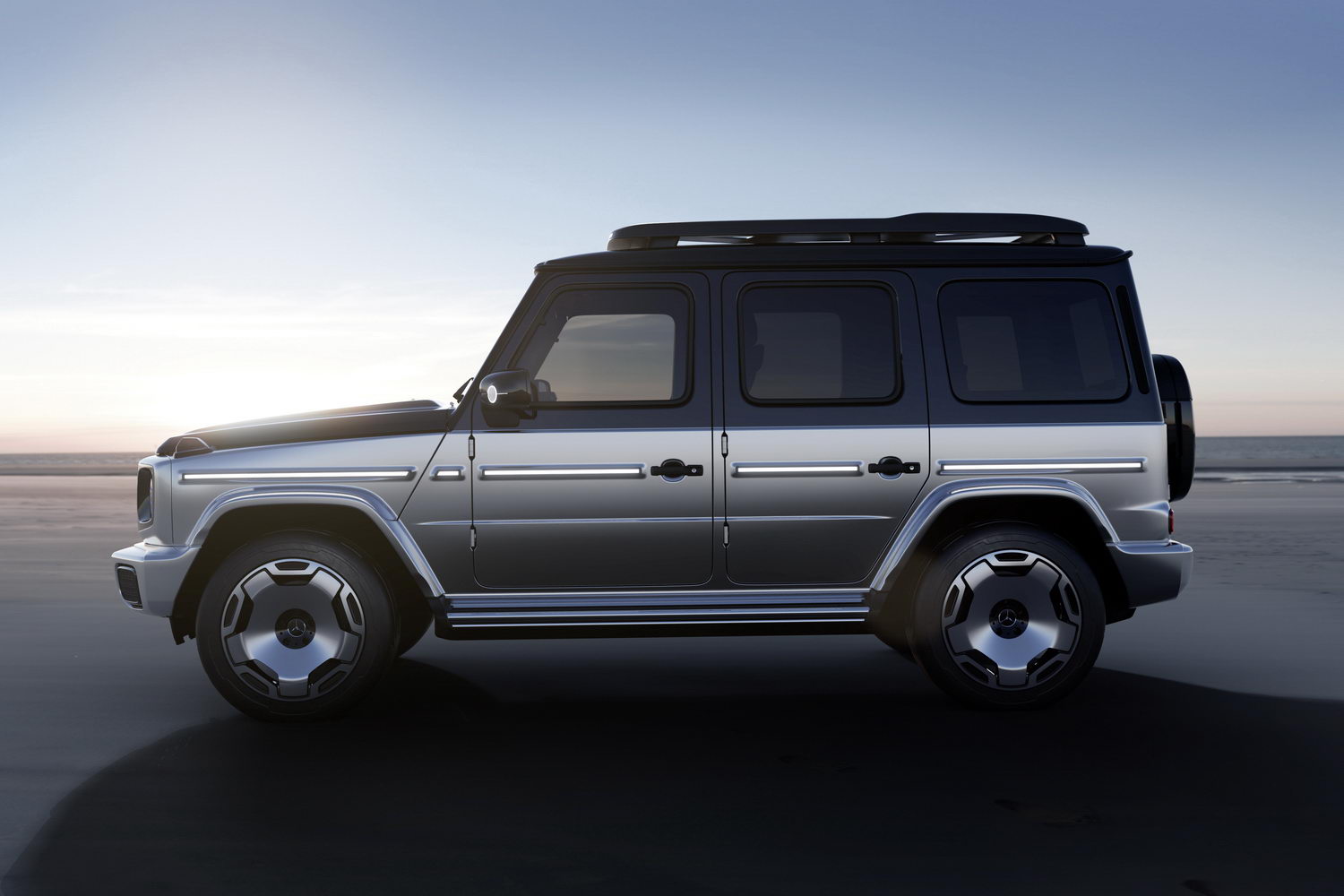 The concept, which Mercedes is calling the EQG as per its new electric nomenclature, looks just like a squarely old-fashioned G-Class finished in its two-tone black and aluminium-coloured paint, but with a few up-to-date details.