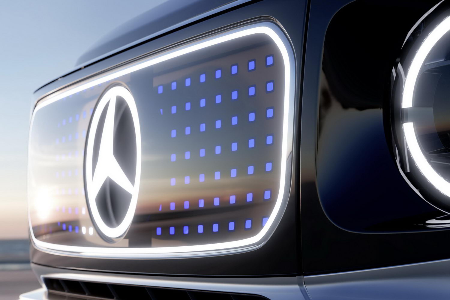 Instead of a grille, the EQG gets a single black panel with the three-pointed-star standing-out, illuminated in a 3D effect. Around the star, animated blue "squircles" form a familial link with the rest of the EQ range, while, behind the screen, the circular pattern of the daytime-running-lamps shines out.