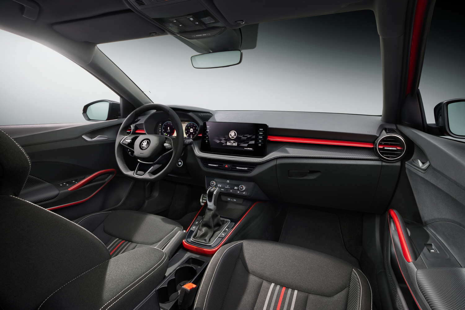 Inside, the Fabia Monte Carlo gets a striking black and red cabin, with most of the materials on show being black, but with striking bright red highlights such as the centre console, the dashboard 'spar', and the door pulls. There are also some splashes of carbon-fibre-look trim around the place, and high-backed sports seats with rally stripes. Oh, and if you go for the digital instrument panel, you get special Monte Carlo graphics, too.