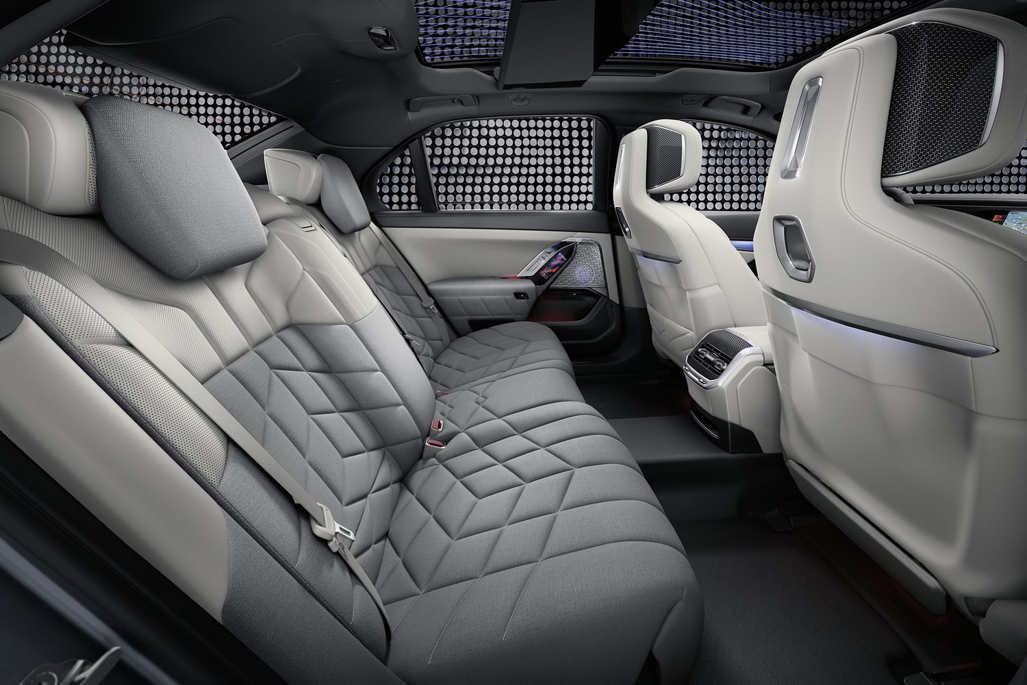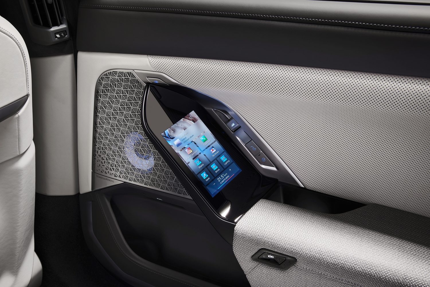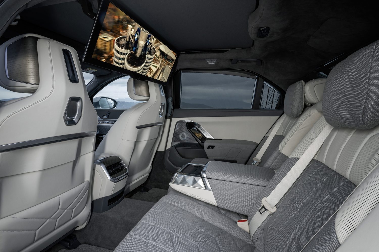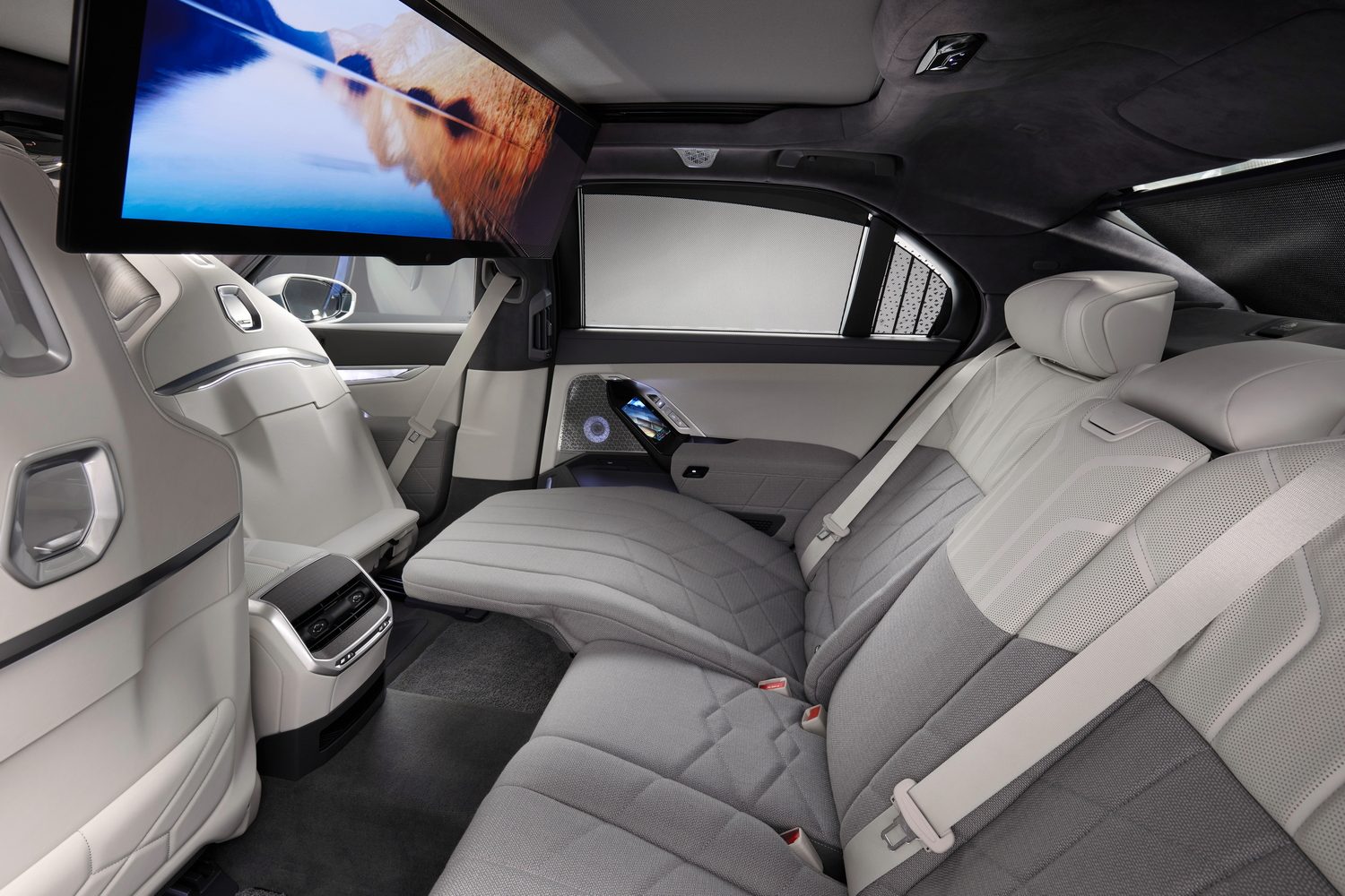 Stepping past those doors, not into the front seat but into the rear, occupants are also faced with some of the 7 Series' other more expensive options such as the 31.3-inch BMW Theatre Screen, an 8K-resolution high-definition display that flips down from the roof and features Amazon Fire TV for streaming a wide range of content. As soon as the screen is switched on, the car's window blinds descend automatically to prevent glare, and the screen's audio can either be tuned to a set of Bluetooth headphones or heard aloud through the Bowers & Wilkins surround sound system, which has speakers built into the seats. The screen can be moved around to make it more visible or accessible to the rear-seat passengers and can be remotely controlled by smartphone-sized touch-panels on the rear doors.