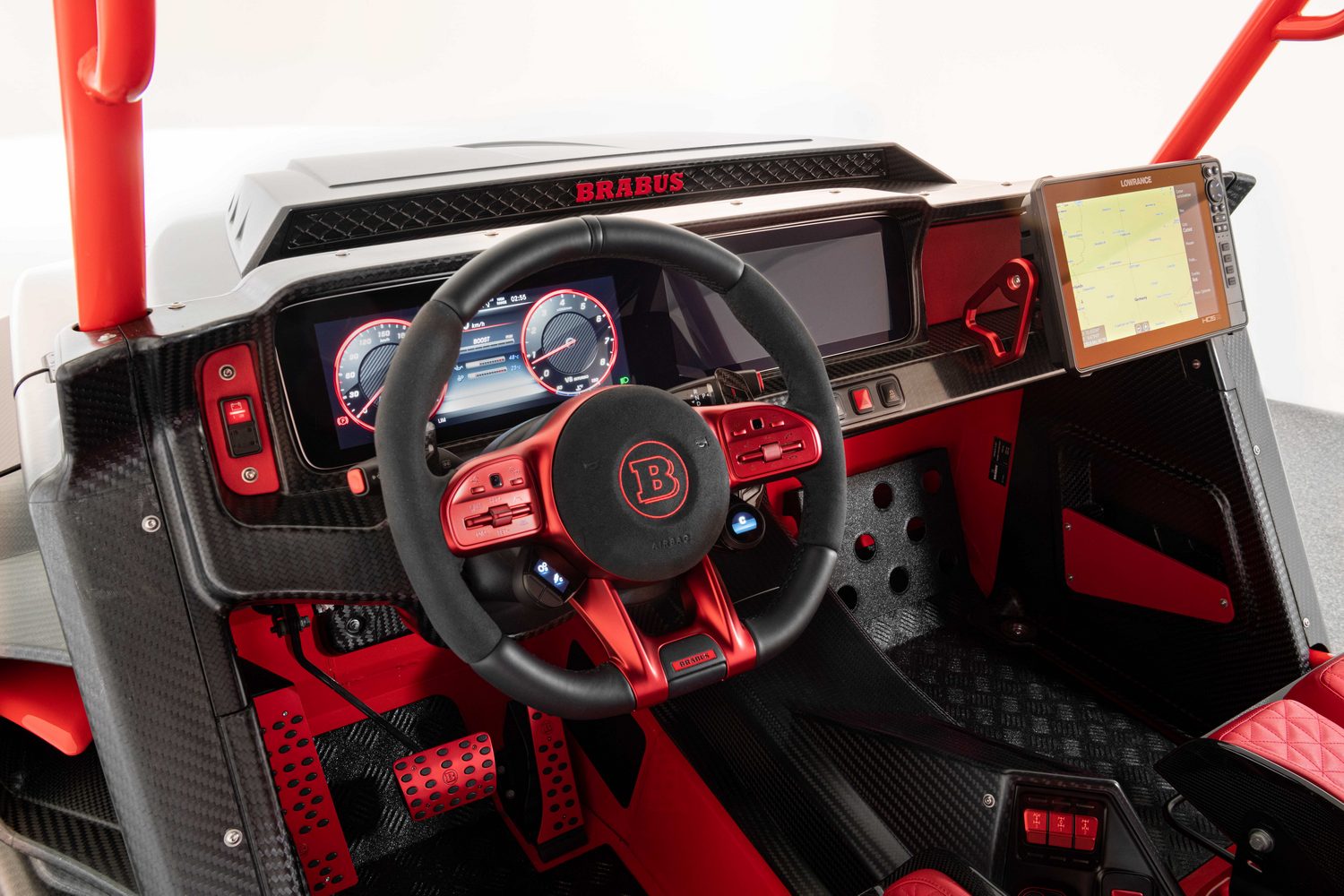 Although based on the Mercedes G-Class, the 900 Crawler takes a form more akin to an off-road buggy with a tubular frame chassis specially developed by Brabus. That chassis is particularly visible given the Crawler's relative lack of bodywork (there are no doors or windows) and the fact that the exposed tubes are painted bright red. The chassis frame also serves the function of a safety cell and roll cage should things go pear-shaped.