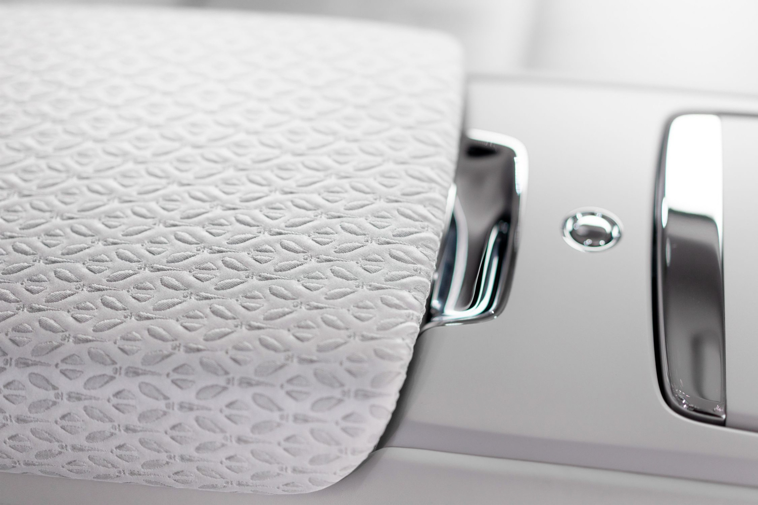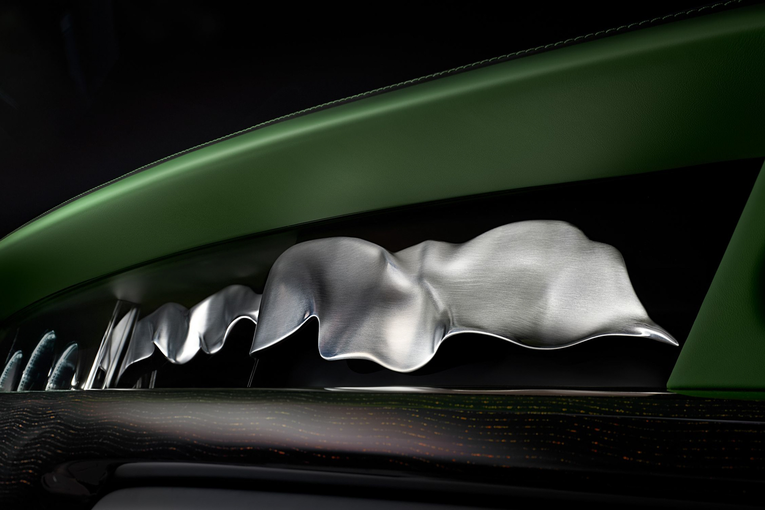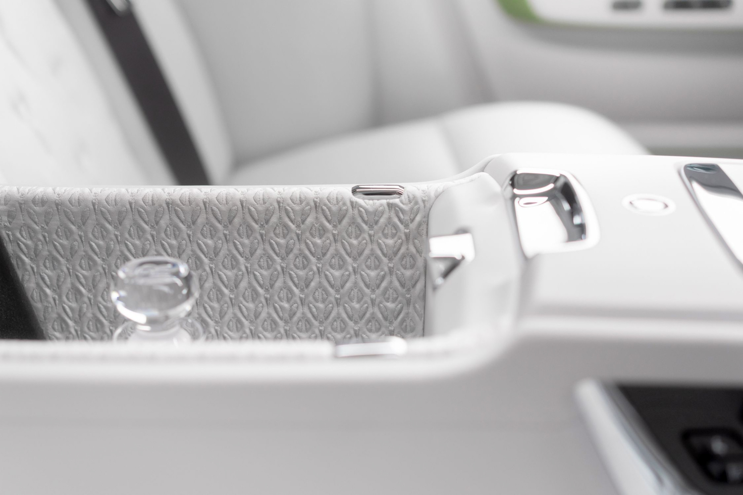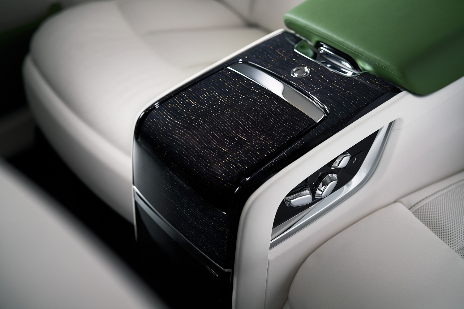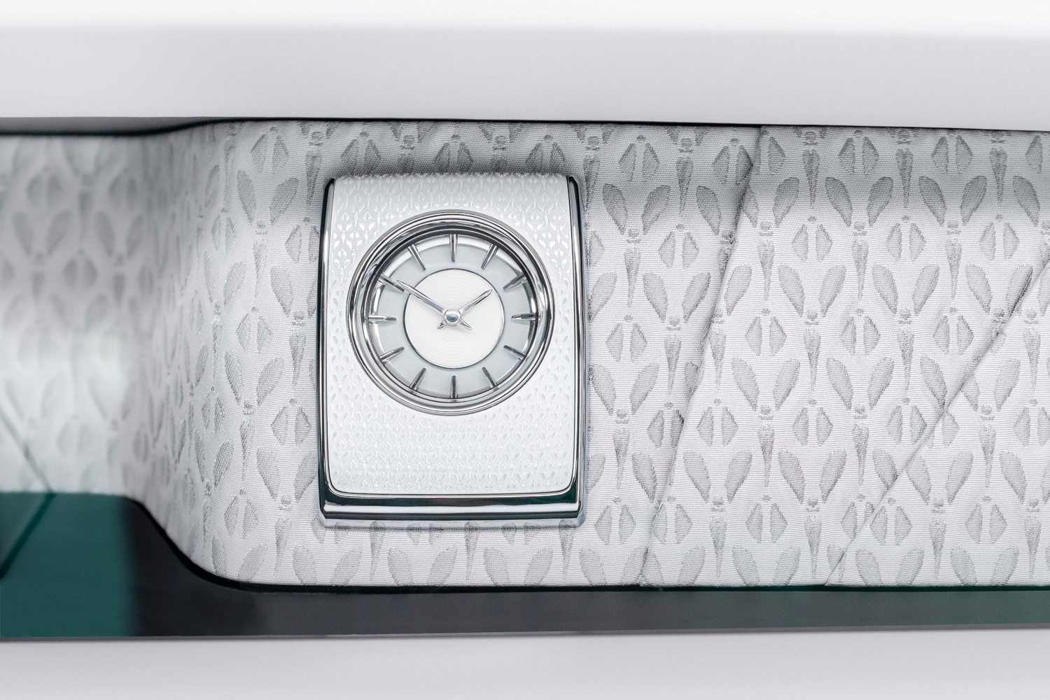 The Phantom Platino's front seats are finished in leather, but those in the back are clad in a combination of white silk and material made from bamboo fibres, the latter being a somewhat tougher fabric, meaning it's placed in the parts of the seats that are likely to see the most wear. Both fabrics are embroidered with an abstract interpretation of the Spirit of Ecstasy design which also appears on the rear arm-rests and, in the front, on the panel surrounding the car's clock.