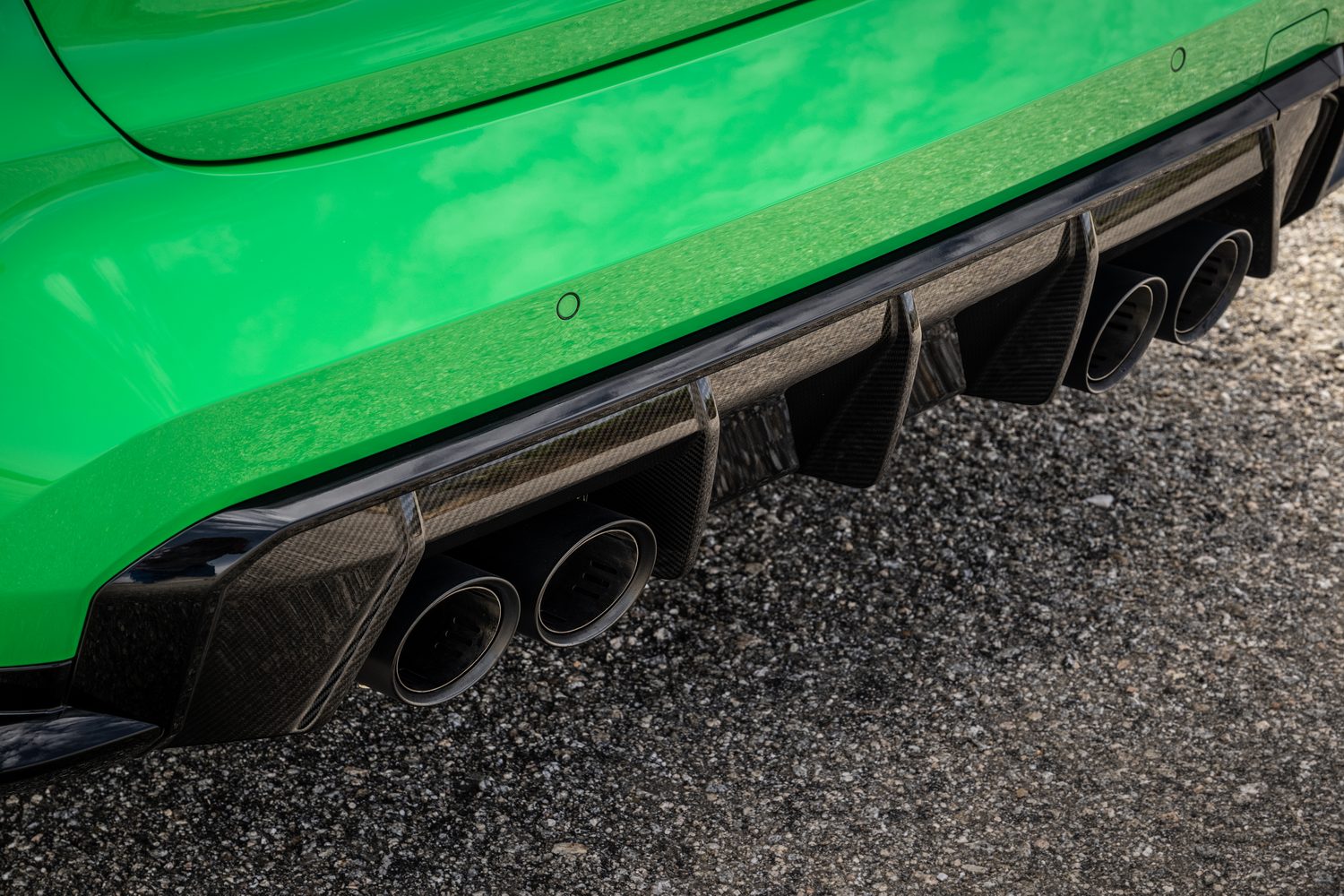 Compared with the BMW M3 Competition with M xDrive, the M3 CS is 20kg lighter. That's thanks to extensive use of carbon fibre-reinforced plastic (CFRP) for the bonnet, front splitter, front air intakes, exterior mirror caps, rear diffuser spoiler on the exterior, along with the centre console, the shift paddles on the steering wheel and various trim strips inside - not to forget the M Carbon bucket seats and the titanium exhaust silencer.