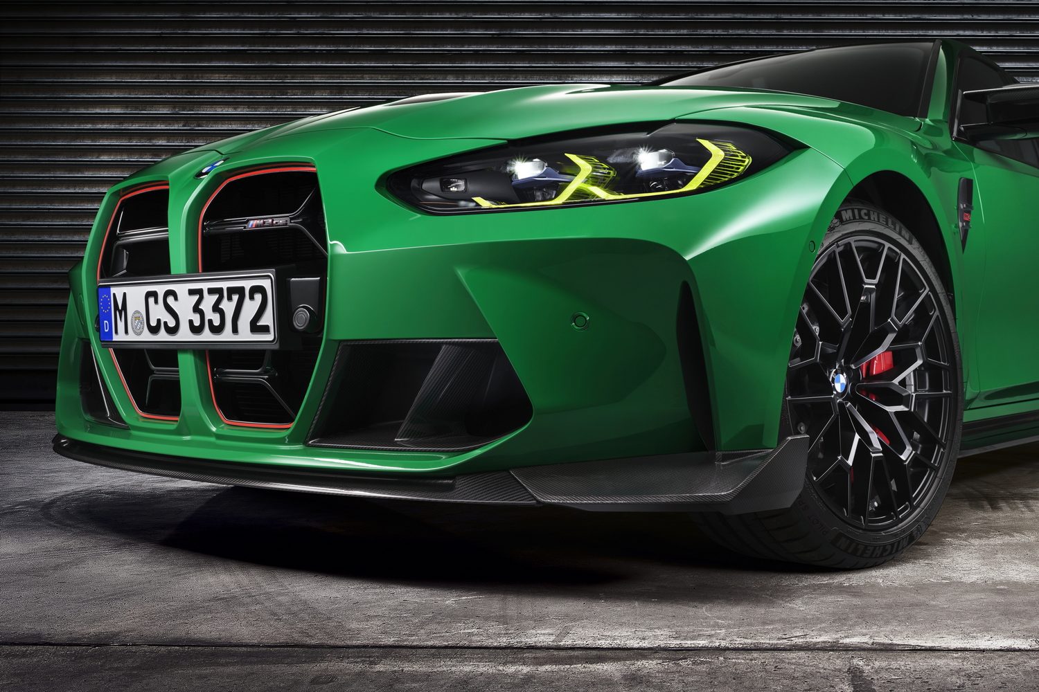 Some of that carbon lends the M3 CS its unique design, as there's exposed material on the bonnet, while the aerodynamic splitter under the restyled kidney grille is more prominent than in other M3s. Red and black is used on the M3 CS badging throughout, while the standard BMW Laserlight headlamps use yellow instead of white for a distinctive appearance that references GT racing.