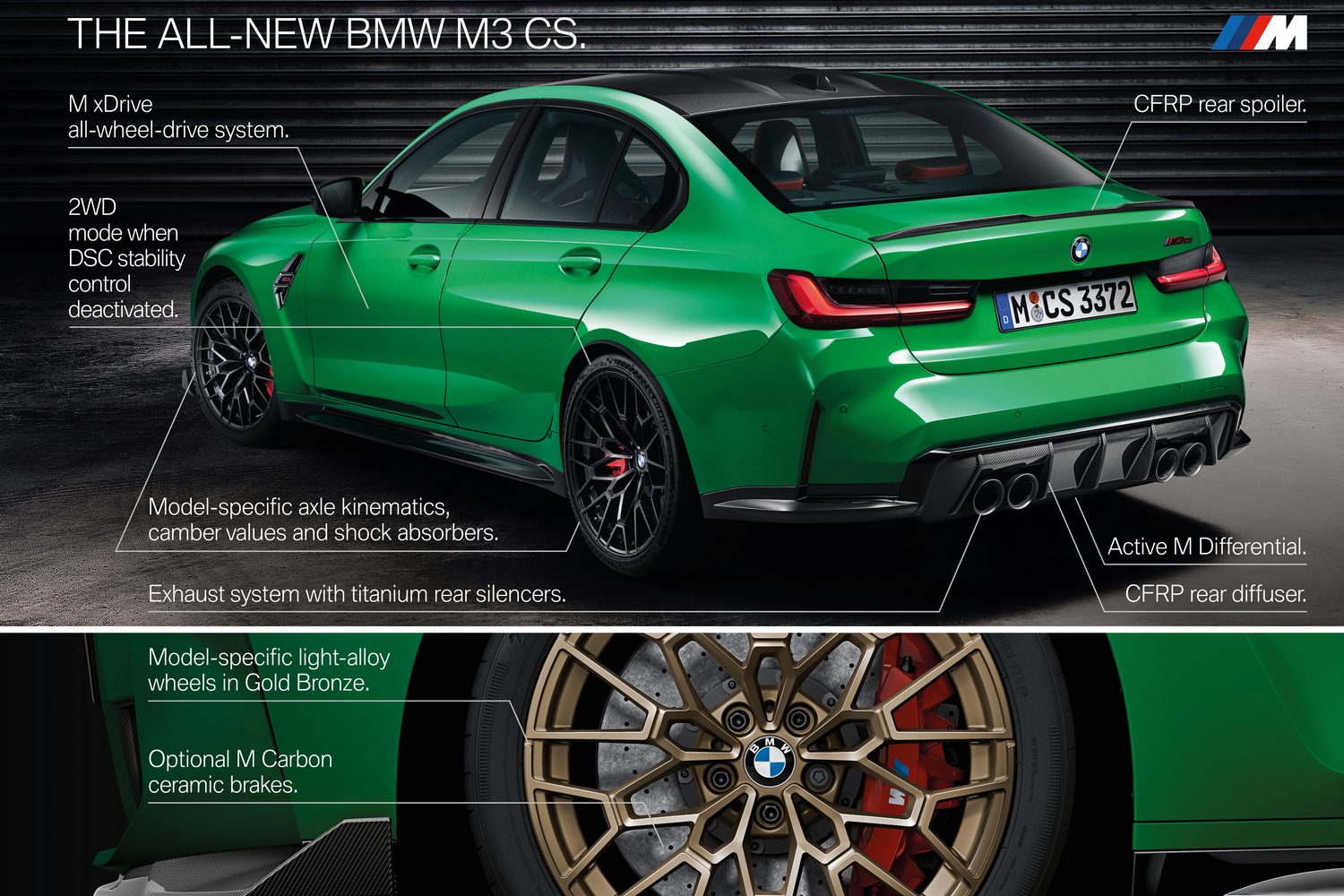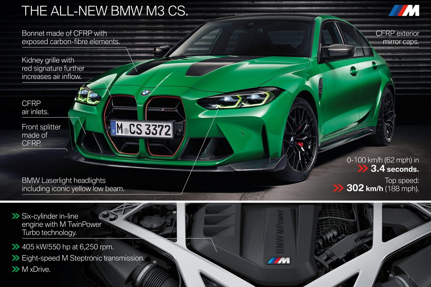 BMW quotes a 0-100km/h time of just 3.4 seconds for the M3 CS, which is 0.3 seconds quicker than the rear-drive M4 CSL coupe can manage. The CS is only 0.1 seconds quicker to 100km/h than the M3 Competition xDrive, however.