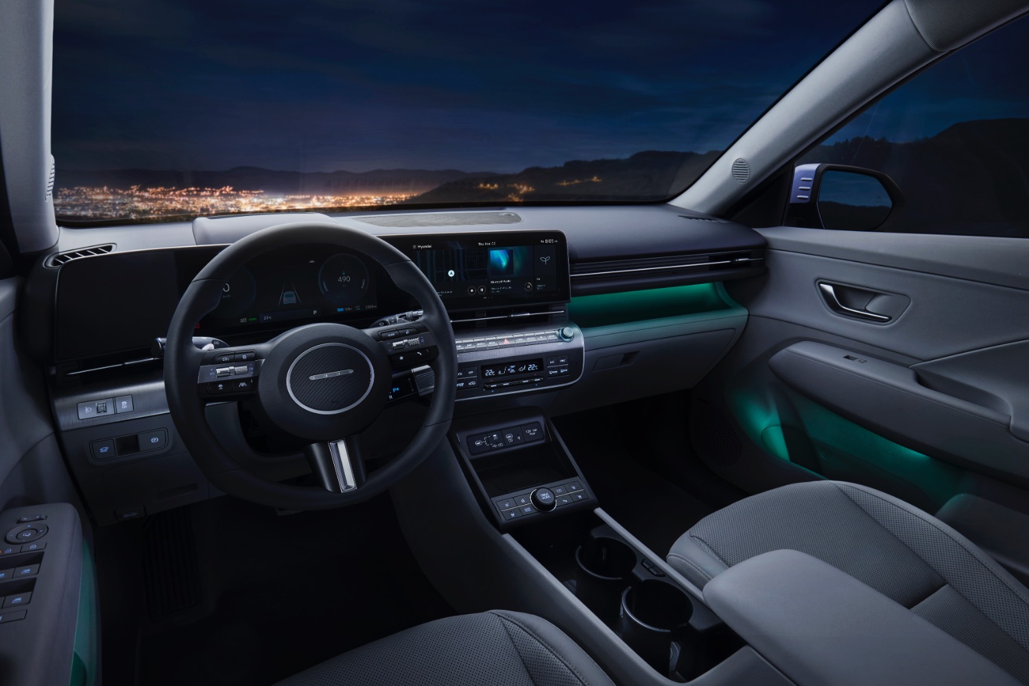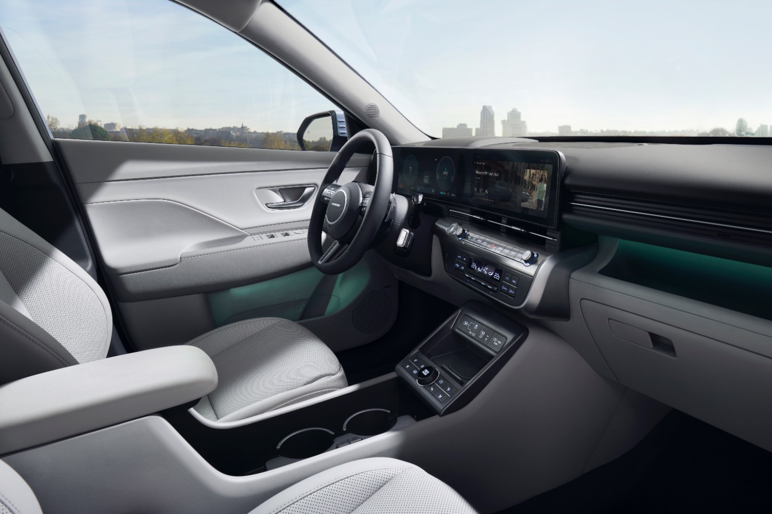 The Kona's cabin draws on the hugely successful Ioniq 5 for its style and tech, with a slab of digital screens in front of the driver and atop the dashboard and lots of storage space in the centre console thanks to the fact that the gear selector has been moved to the steering column.