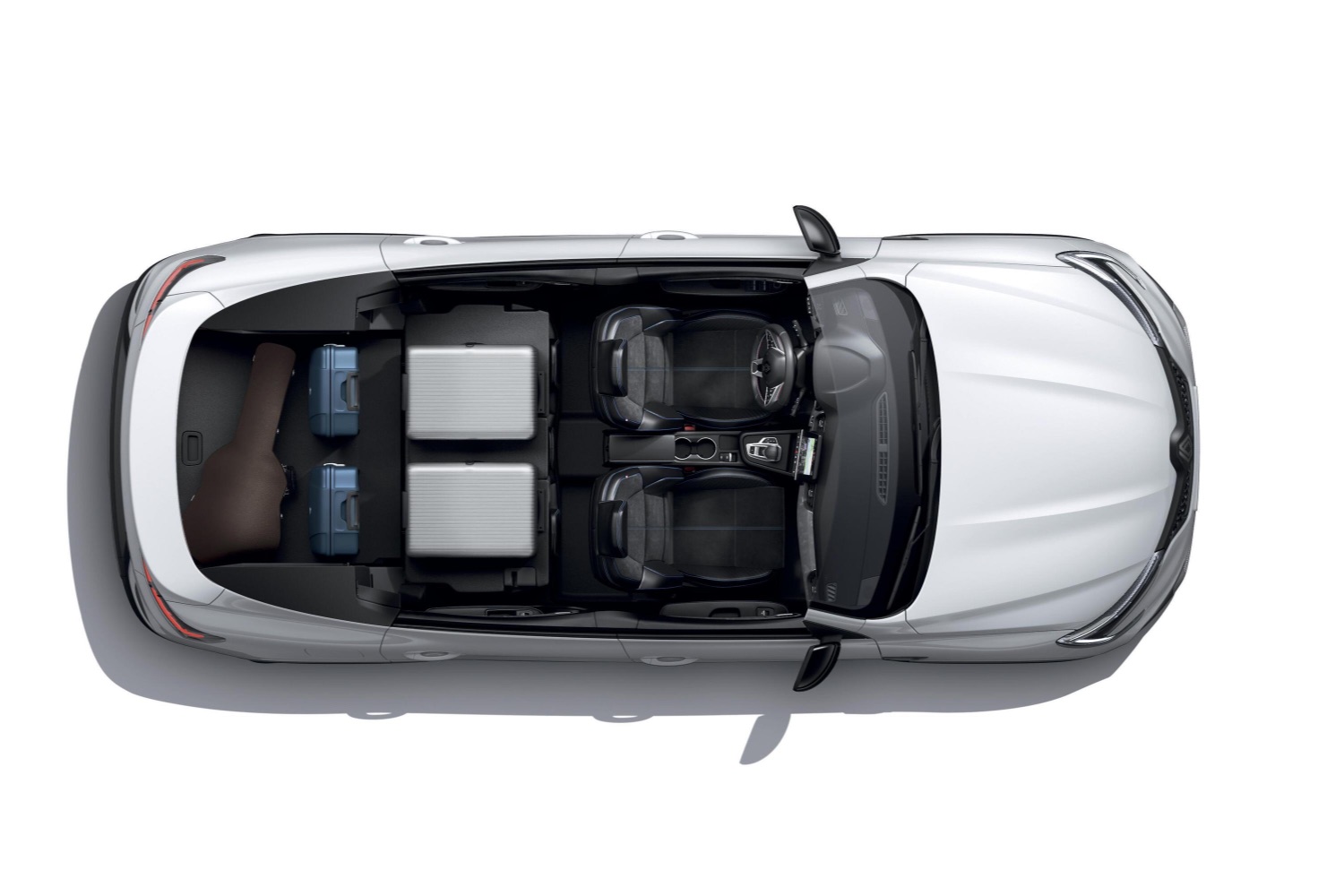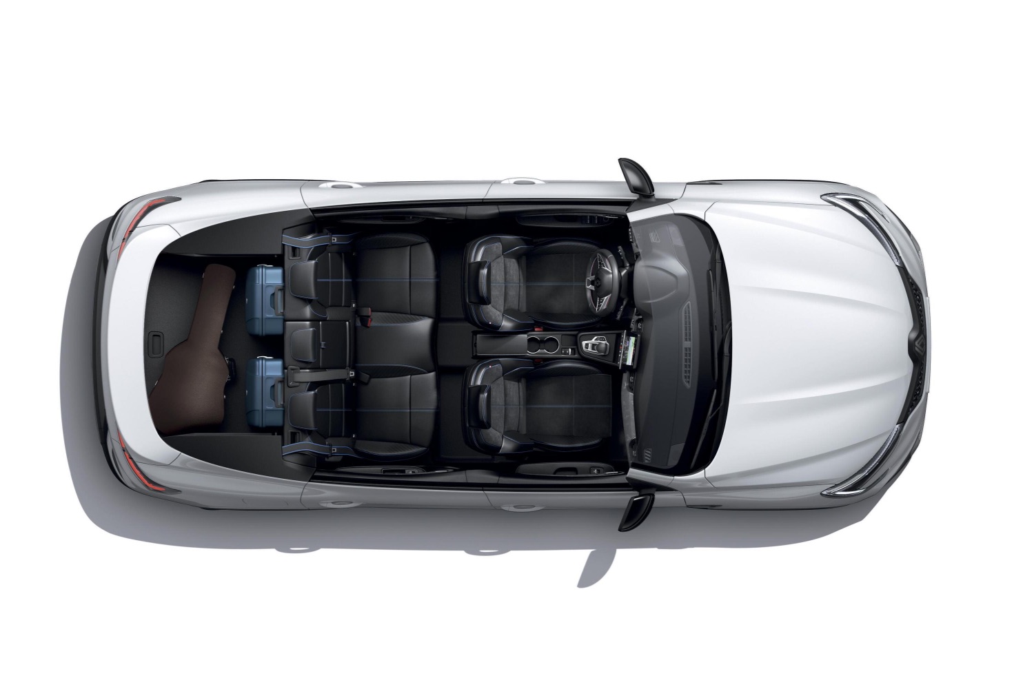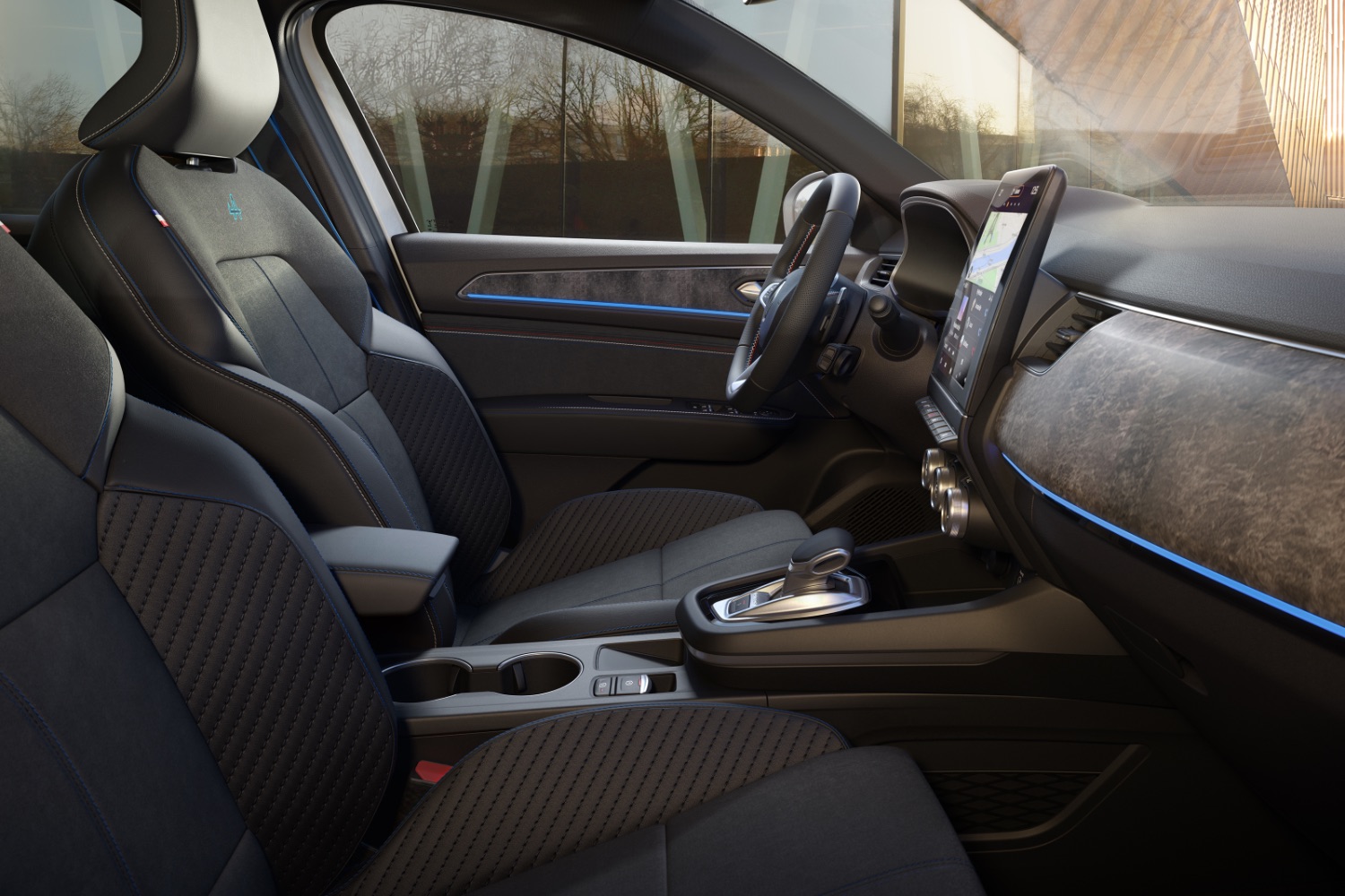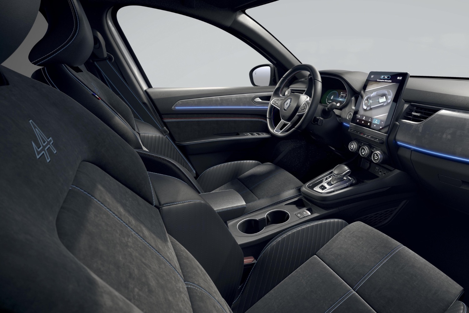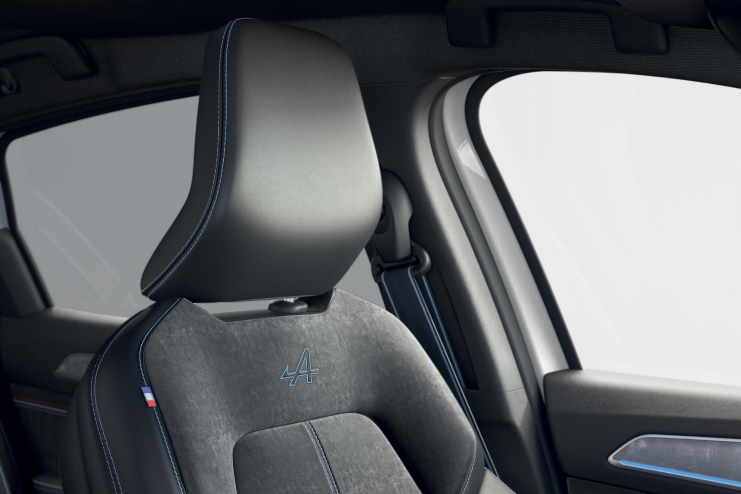 The interior materials are a mixture of Eco Tep (made from 10 per cent bio-sourced materials) and imitation suede. The seats have blue horizontal stitching and an Alpine logo, with blue-striped seatbelts to match.