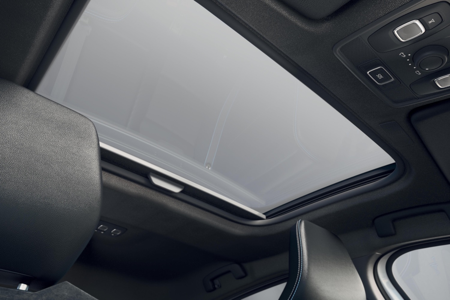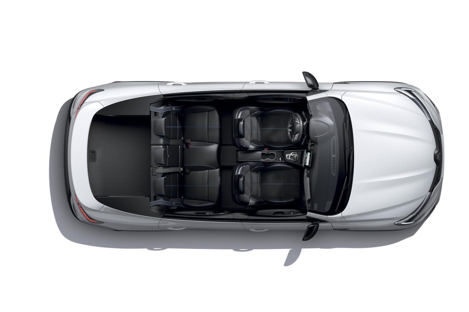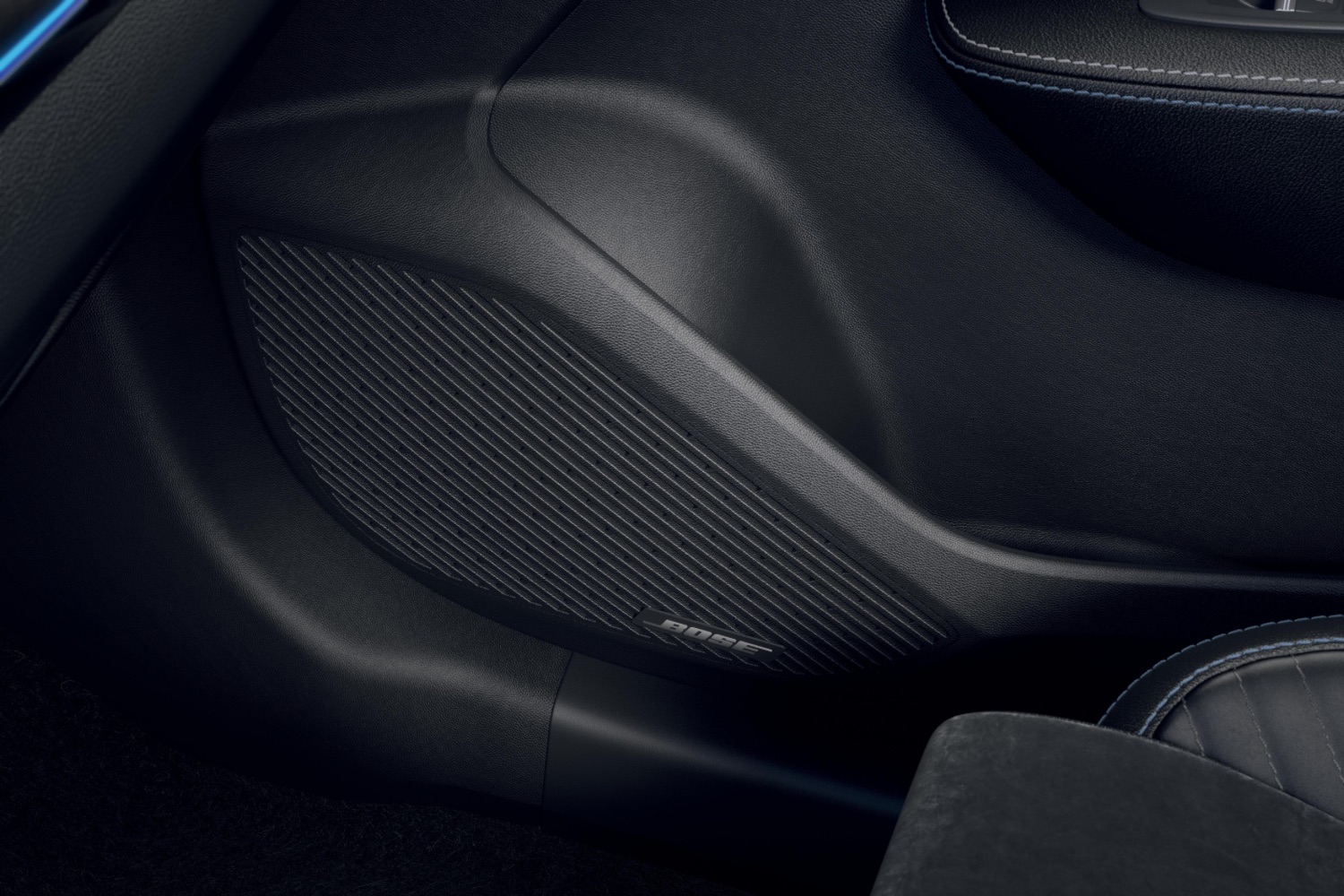 The door inserts and the steering wheel feature red, white and blue stitching, with slate-like cladding on the dashboard.