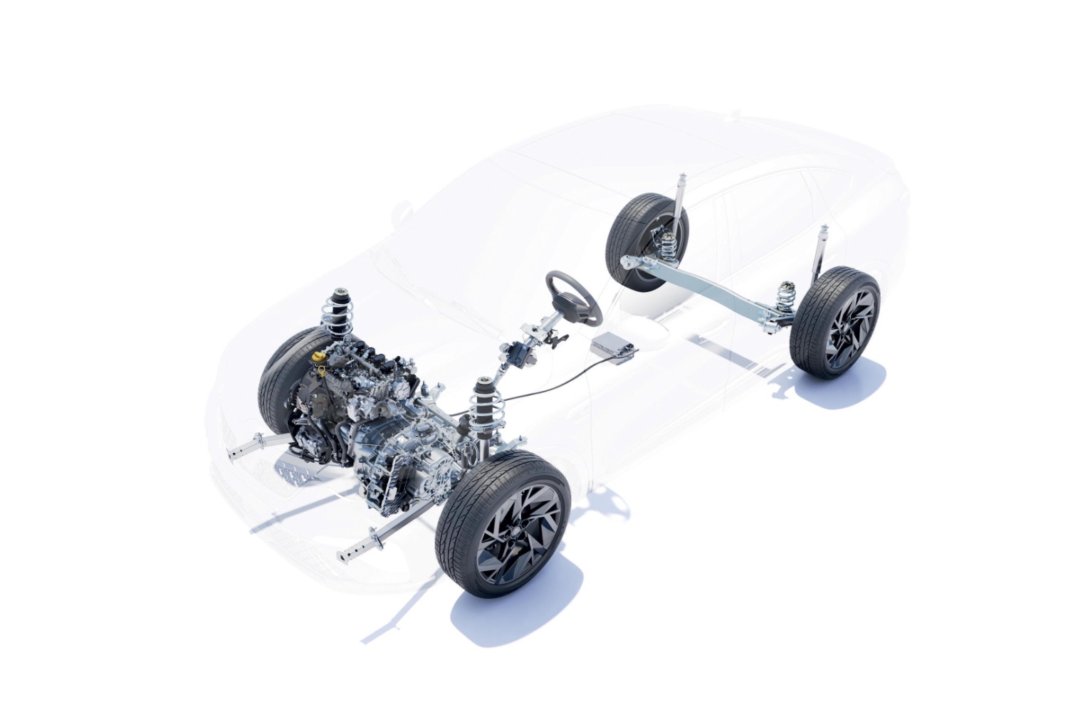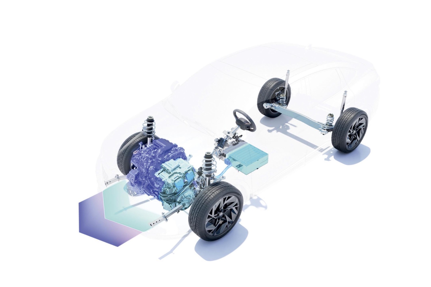 The full-hybrid powertrain uses a 36kW electric motor and an 18kW high-voltage starter generator with a 1.6-litre, four-cylinder petrol engine developing 94hp. These are connected to a multi-mode clutch-less gearbox and a 1.2kW battery.