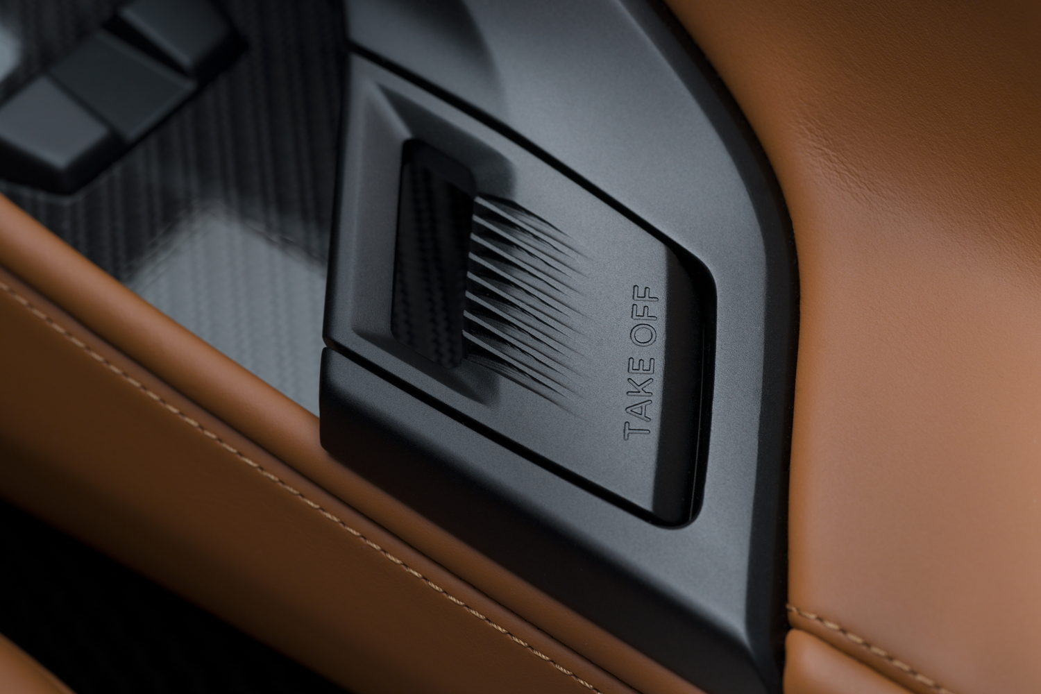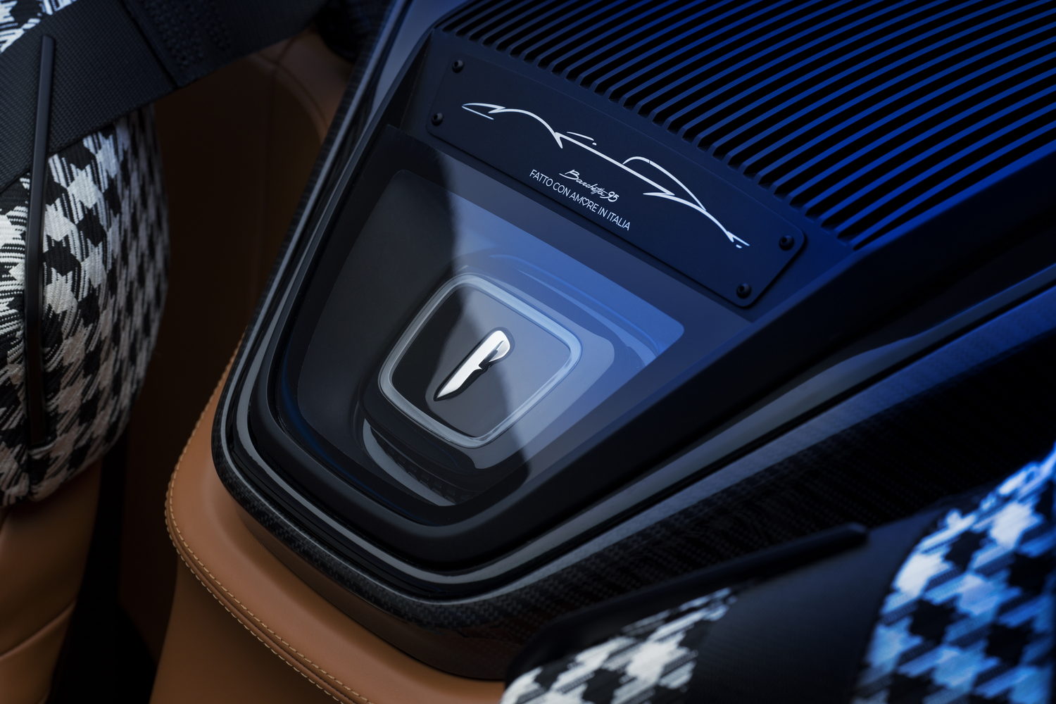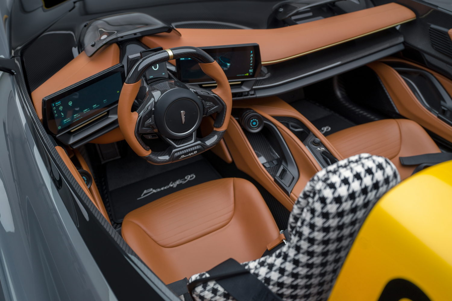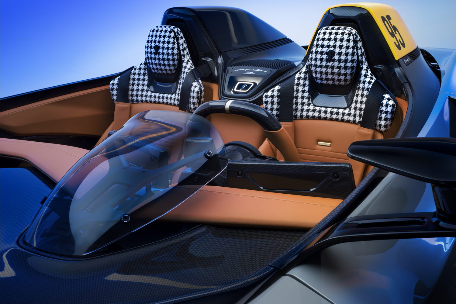 That interior will be entirely configurable by the 10 lucky customers, and for Monterey Car Week the display model showcases what's possible. Tan leather is wrapped around the carbon-shelled seats, doors and across the dashboard, while special houndstooth fabric has been applied to the headrests.
