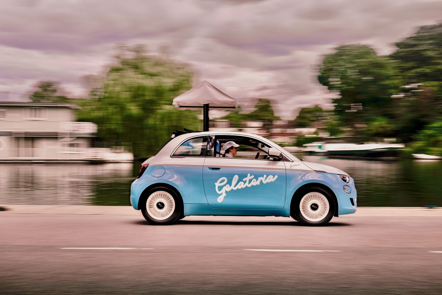 Well, thankfully, Fiat has a solution, and it's the cutest solution to this ice-cream van crisis that you could imagine. It's a concept car based on the electric 500e Convertible called the Gelateria Edition.