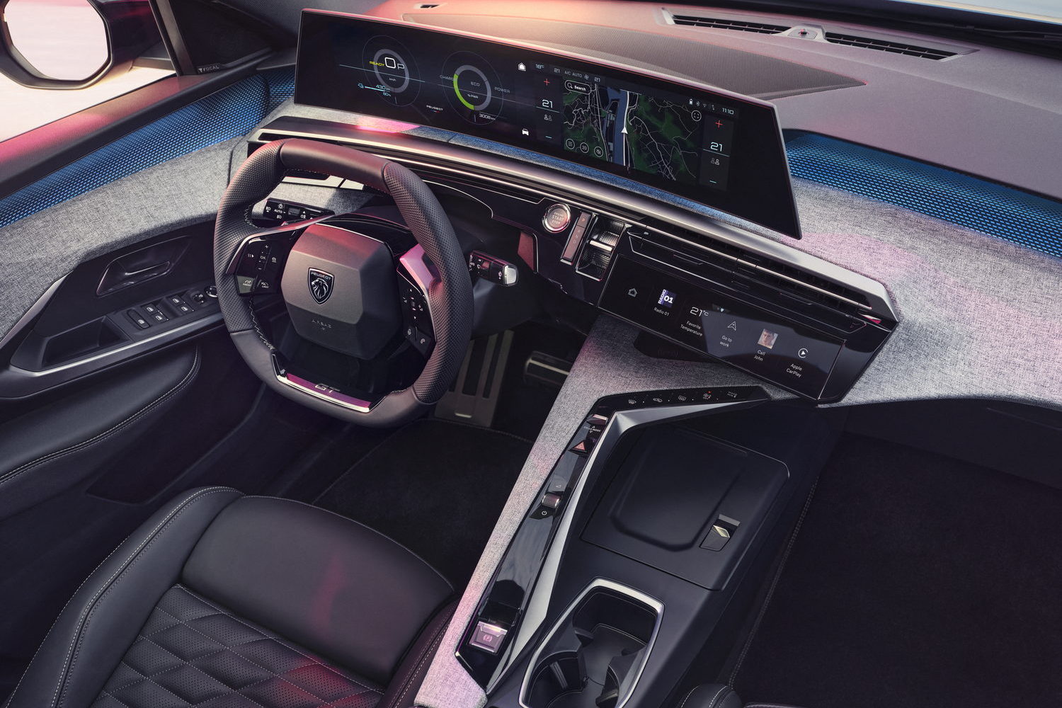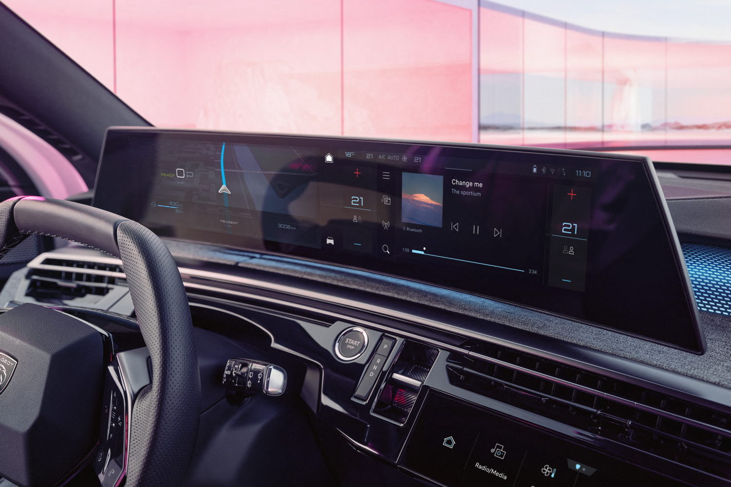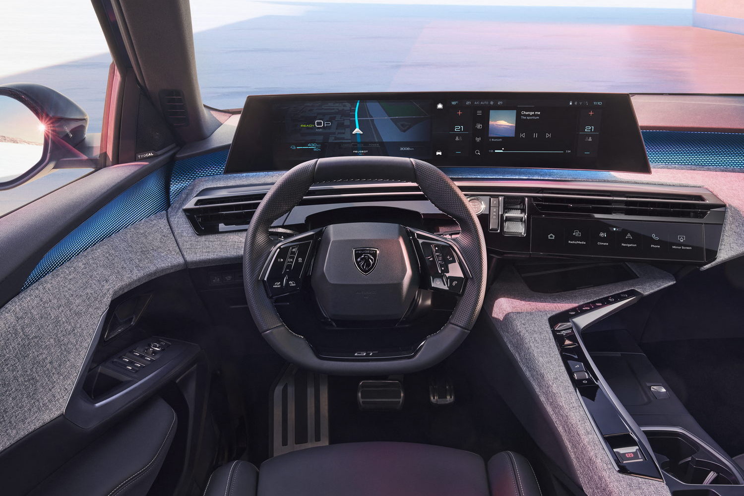 Inside, it's a new evolution of Peugeot's i-Cockpit layout. This one's called Panoramic i-Cockpit, because there's a massive, curved, 21-inch high-def screen dominating the top of the dash and combining the driver's instrument cluster with the main touchscreen interface of the infotainment system.