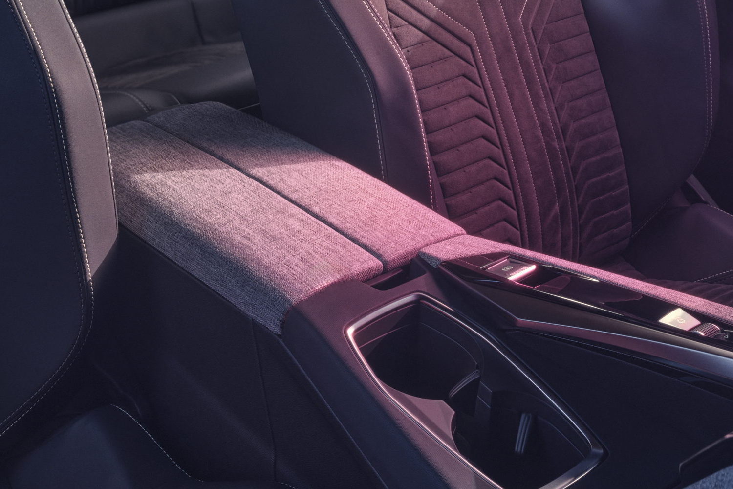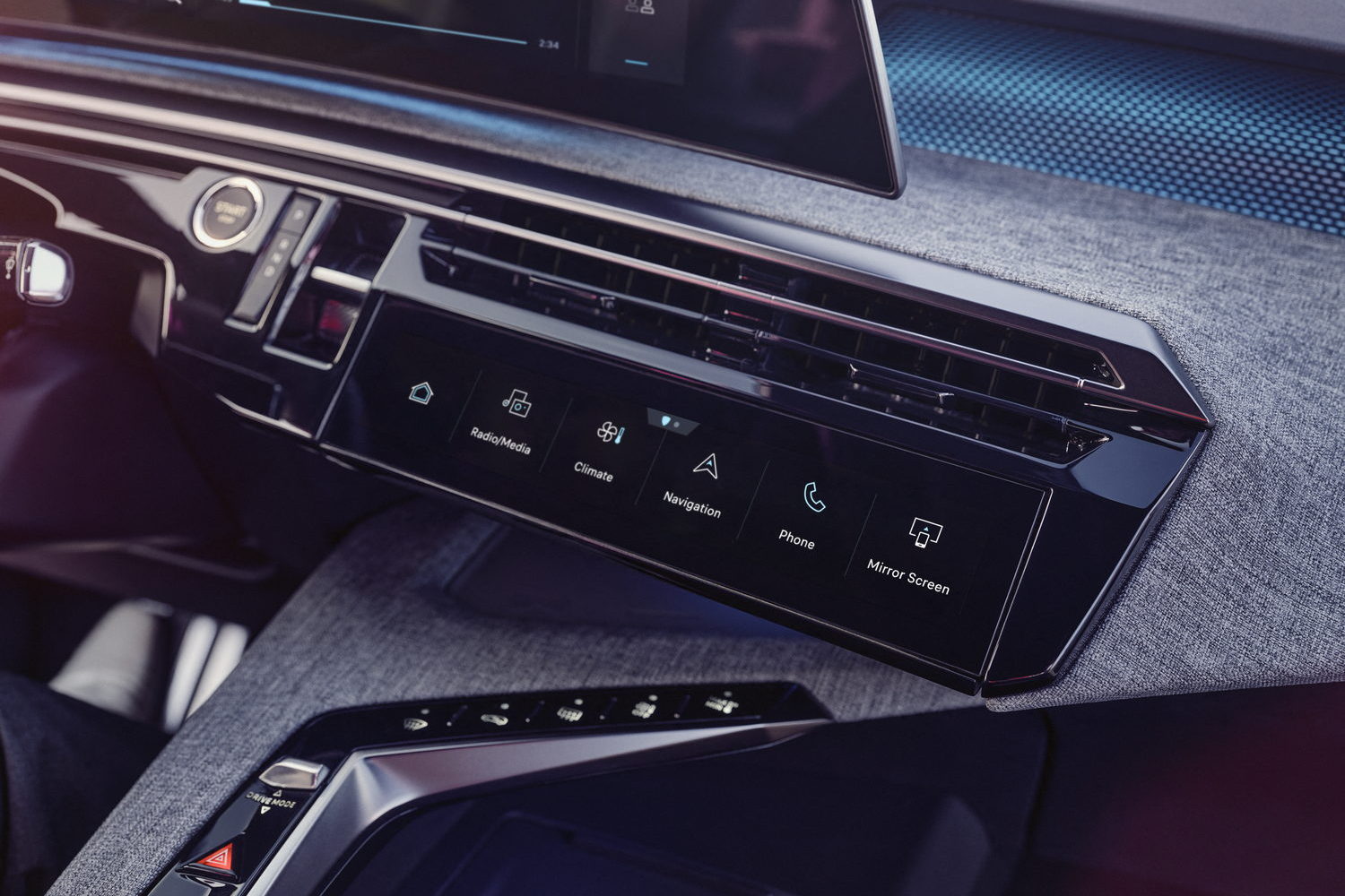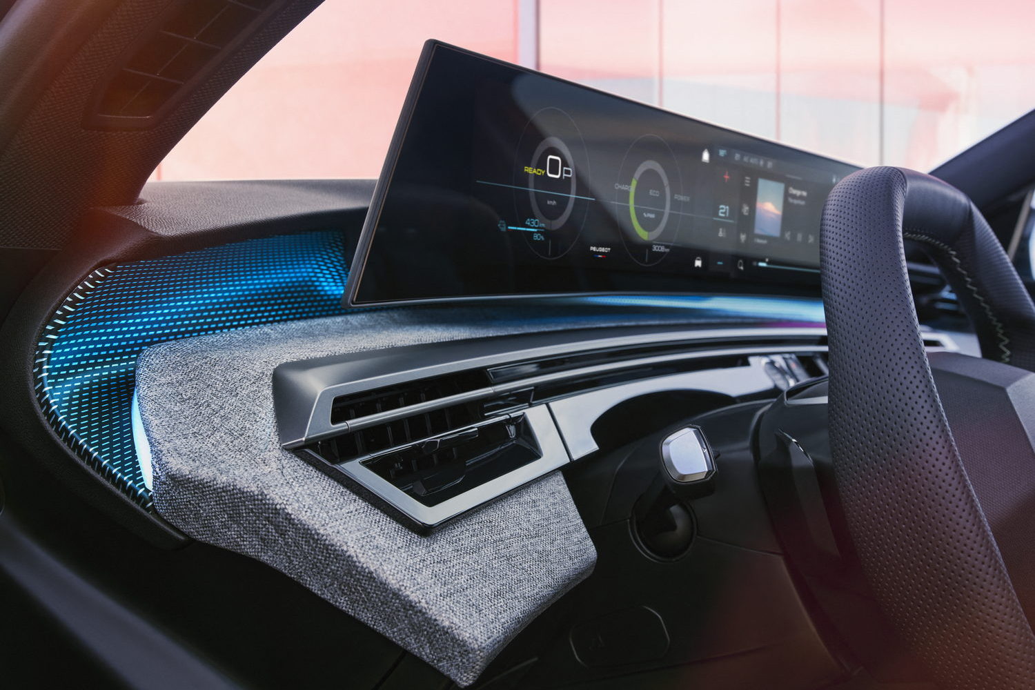 Inside, it's a new evolution of Peugeot's i-Cockpit layout. This one's called Panoramic i-Cockpit, because there's a massive, curved, 21-inch high-def screen dominating the top of the dash and combining the driver's instrument cluster with the main touchscreen interface of the infotainment system.