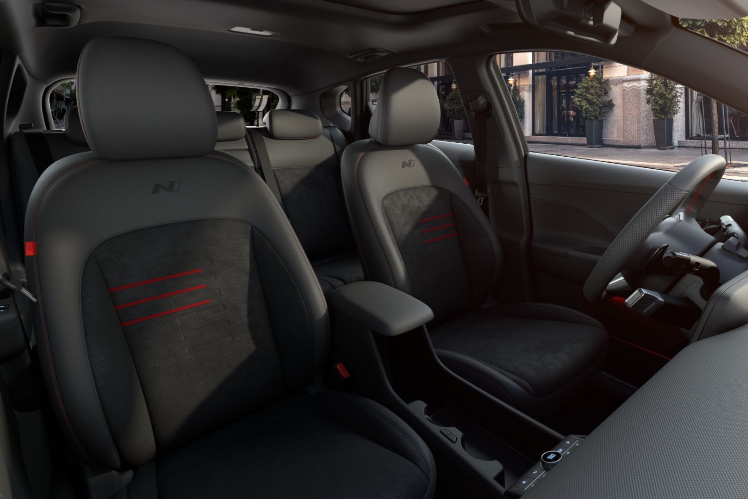 Two versions of the N-Line Kona Electric will be offered; an N-Line and an N-Line S. As standard, the N-Line gets cloth sports seats, while the N-Line S gets an 'Eco Alcantara' and leather interior. That Eco Alcantara is a man-made suede created from 57 per cent recycled polyester.