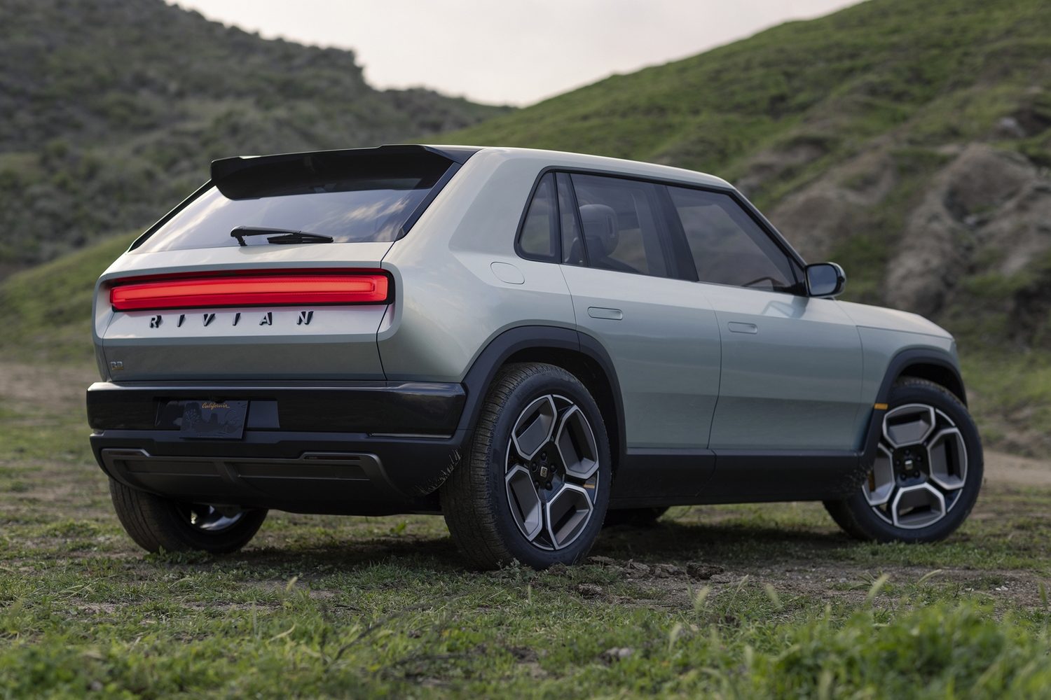 Unlike Tesla's very smoothed-off, pebble-like design for the Model Y, the Rivian R2 is more obviously SUV-like in its look, with an upright nose featuring the company's distinctive lozenge-shaped headlights and a full-width light bar. That light bar is mirrored at the back by a full-width brake light. The overall design is exceptionally clean and free from ornamentation.