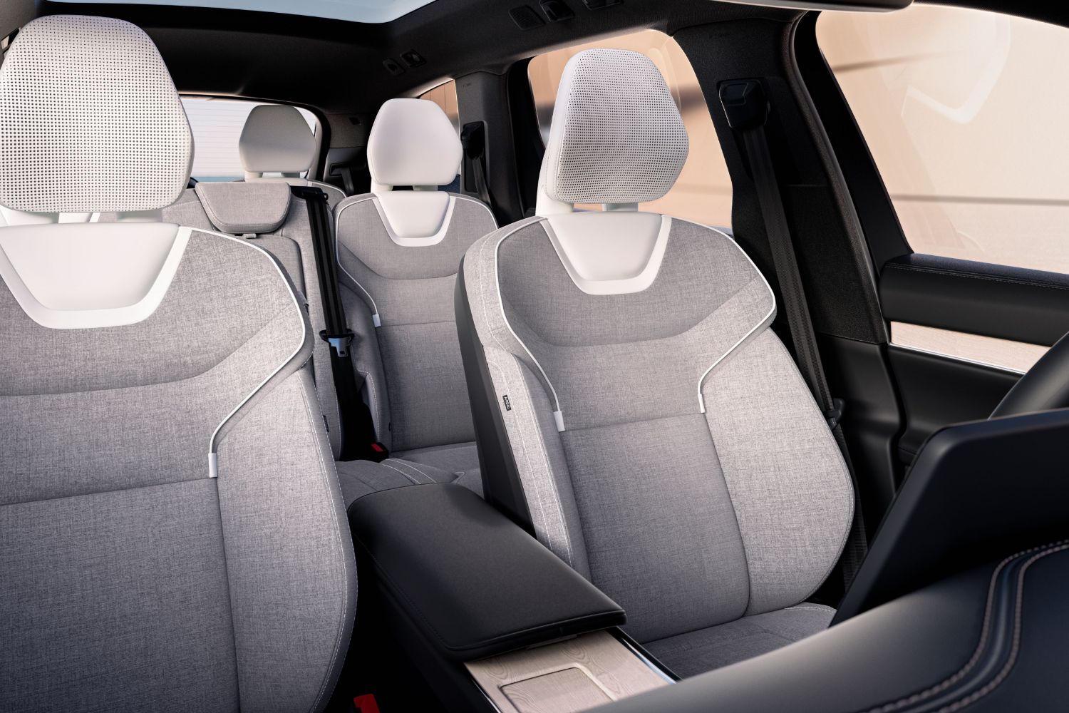 Inside, the cabin is minimalist but welcoming, with the option of wool-blend seat trim in place of the standard man-made leather. There’s a huge 14.5-inch touchscreen in the centre of the dash, using software similar to that deployed by the smaller EX30, but the bigger car has both a driver’s instrument screen and a heads-up display. The high-spec Ultra models come with a 25-speaker Bowers + Wilkins stereo that includes speakers built directly into the headrests. Google software is built-in to the EX90’s infotainment system, so that means you get native Google Assistant voice control, as well as Google Maps. The front of the cabin has generous stowage space, with storage areas in the console, the armrest, a well-sized glovebox, and large door bins. In the back, the EX90 comes with seven seats as standard. The three in the centre row adjust both for rake and fore-aft position, while those in the third row are sufficiently sized for all but the tallest adults. Boot space expands from 310 litres with all seats occupied to 650 litres with the third row folded to 1,910 litres with all back seats folded. An improvement over the XC90 is that there is space under the boot floor to stash the luggage cover when it’s not in use, and the EX90 also has a shallow ‘frunk’ in the nose which is large enough to hold both a charging cable and the tyre inflator kit. The EX90 also contains approximately 15 per cent of recycled steel, 25 per cent of recycled aluminium as well as 48kg of recycled plastics and bio-based materials, which corresponds to around 15 per cent of the total plastic used in the car - the highest level of any Volvo car to date.