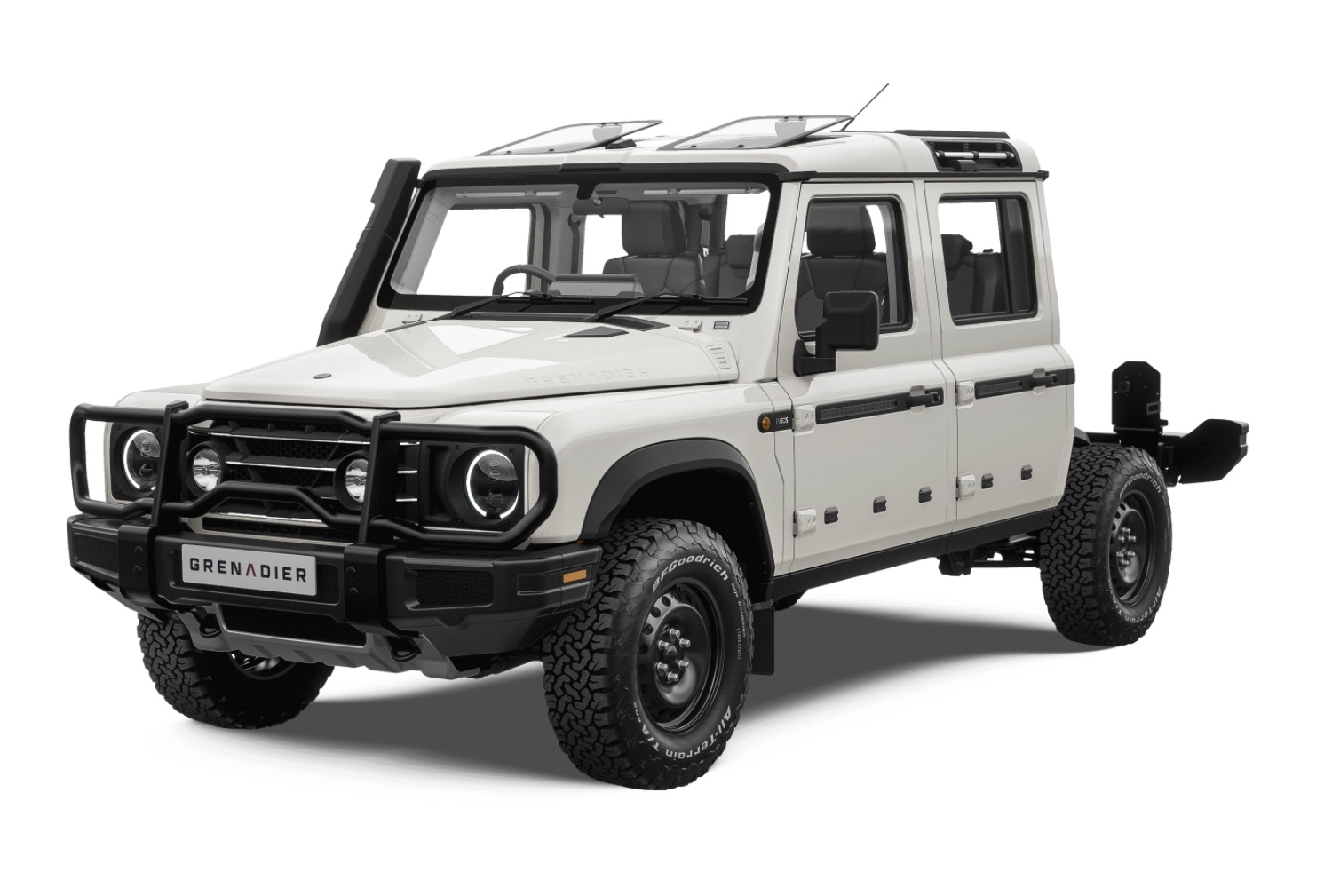 The chassis-cab Quartermaster has a five-seat, four-door body, a full box-section ladder frame chassis, heavy-duty solid beam axles, a two-speed transfer case, and up to three locking differentials, all shared with the regular Grenadier and Quartermaster pickup.