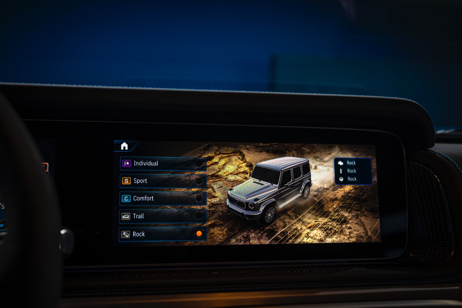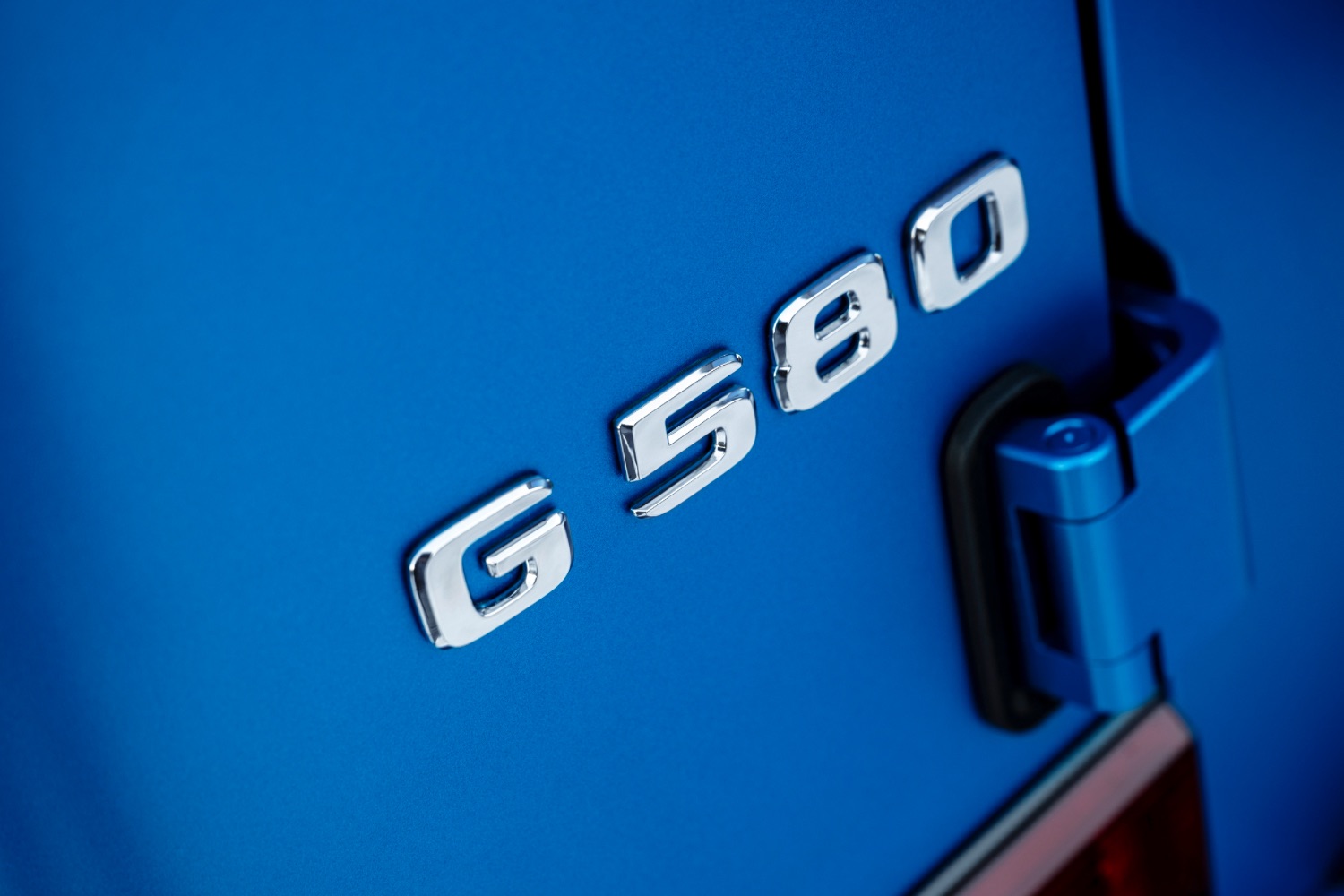 Key to the new model, which wears the G 580 badge, is the new electric all-wheel-drive powertrain, which uses four electric motors to give the vehicle a total output of 587hp. Each motor is individually controlled, and there’s a selectable low-range off-road gear reduction, which is designed to provide more grunt on rough surfaces. There’s even a three-speed intelligent off-road crawl function that works like a kind of off-road cruise control.
