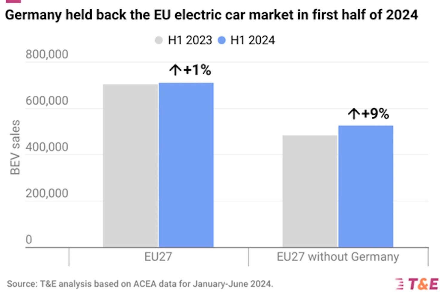 According to research from environmental think-tank Transport & Environment (T&E), Germany’s 16.4 per cent fall in electric car sales dampens the rest of Europe’s numbers. T&E’s numbers show that with the German figures included, Europe’s electric car sales grew by just 1.3 per cent in the first half of this year. Remove the German figures, and that figure improves to 9.4 per cent growth.