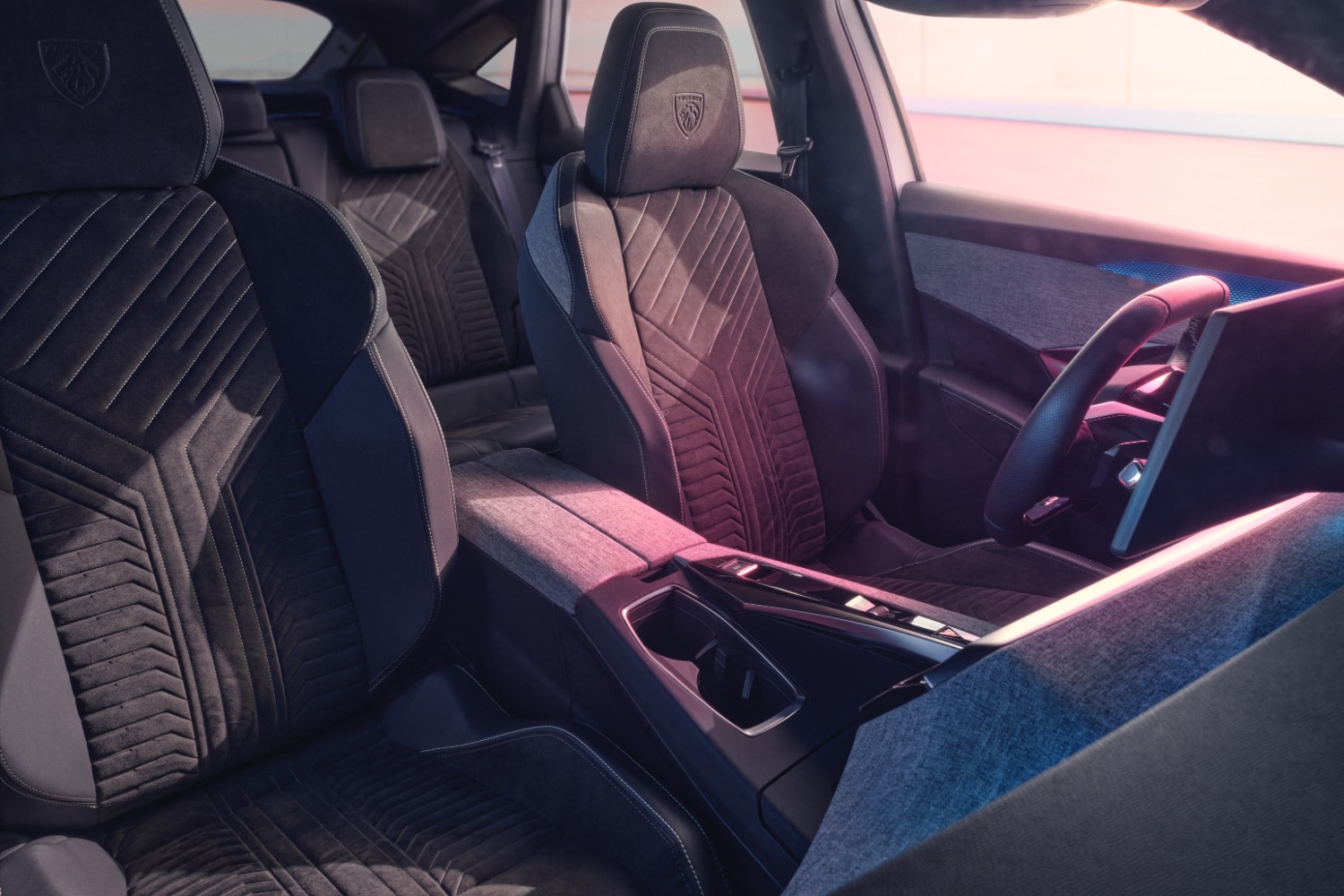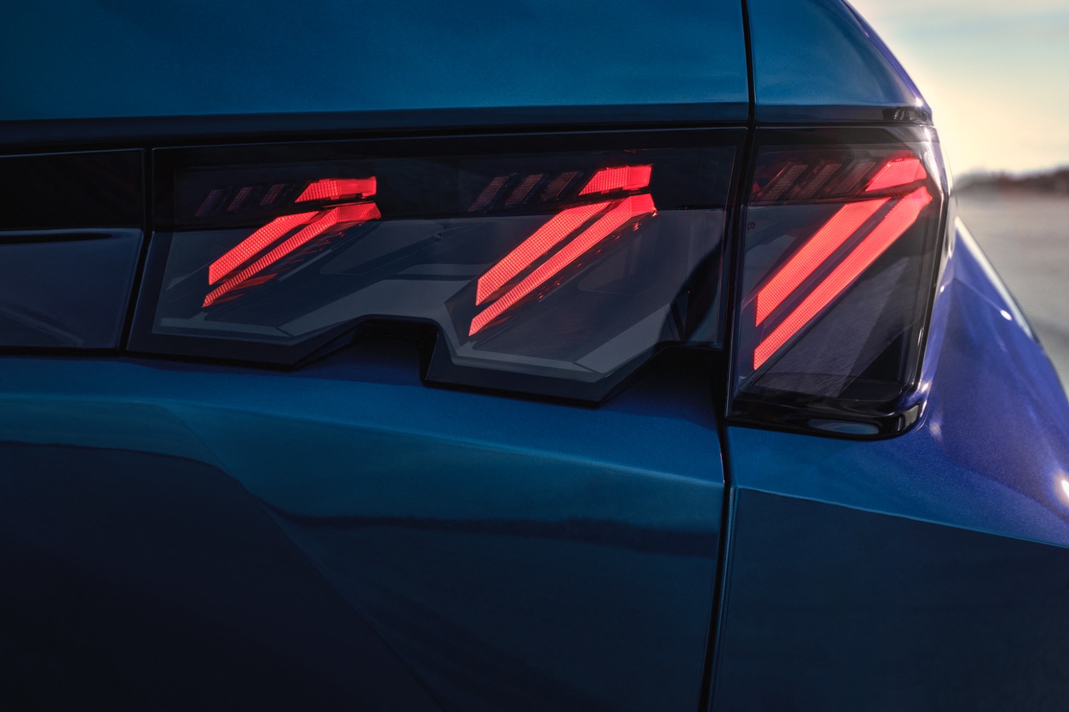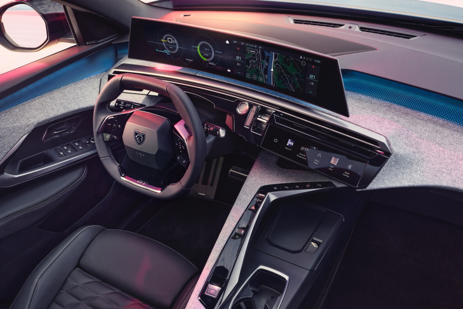GT models add ‘Pixel’ LED headlights, 3D-effect LED rear lights, eight-colour ambient cabin lighting, frameless electrochrome rear view mirror, Alcantara and leather trim, with heated front seats, contrast black roof and rear spoiler, electric tailgate with handsfree operation, rear central armrest with cupholders and storage, ‘Highway Assist’ electronic driver assistance, the Peugeot ‘Shield’ badge on the front wings, and for the electric model in GT form, standard 20-inch alloy wheels.