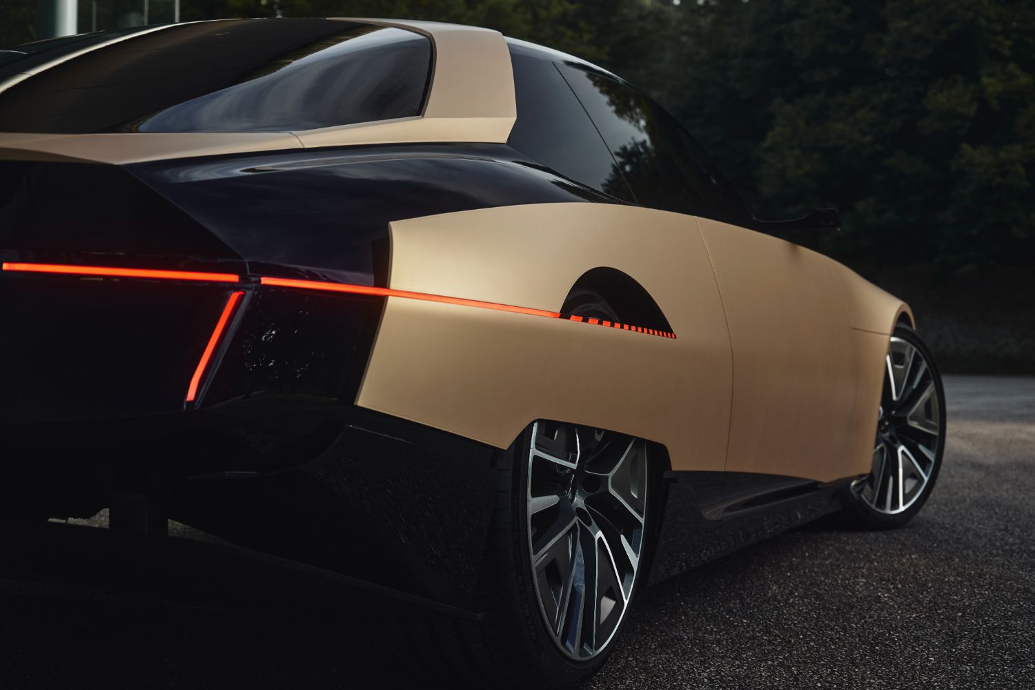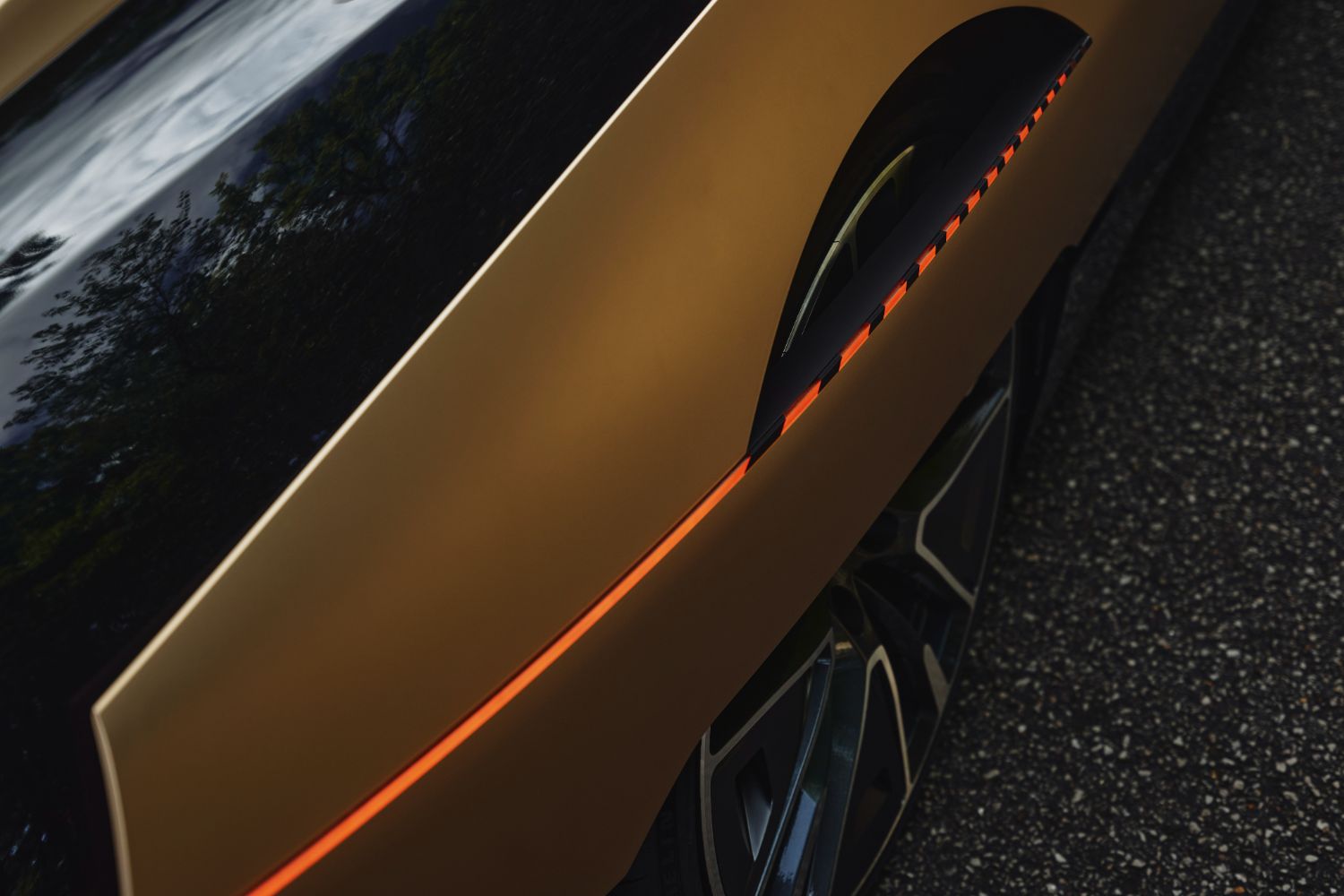 So the SM Tribute shares some of the original SM’s dramatic sharp-nosed, leaning-back shape, complete with disguised rear wheels. In the original SM, the rear wheels are covered by aerodynamic ‘spats’, while on the SM Tribute, the bodywork flows around the centre of the 22-inch rear wheels, leaving the top and bottom of the tyre exposed.