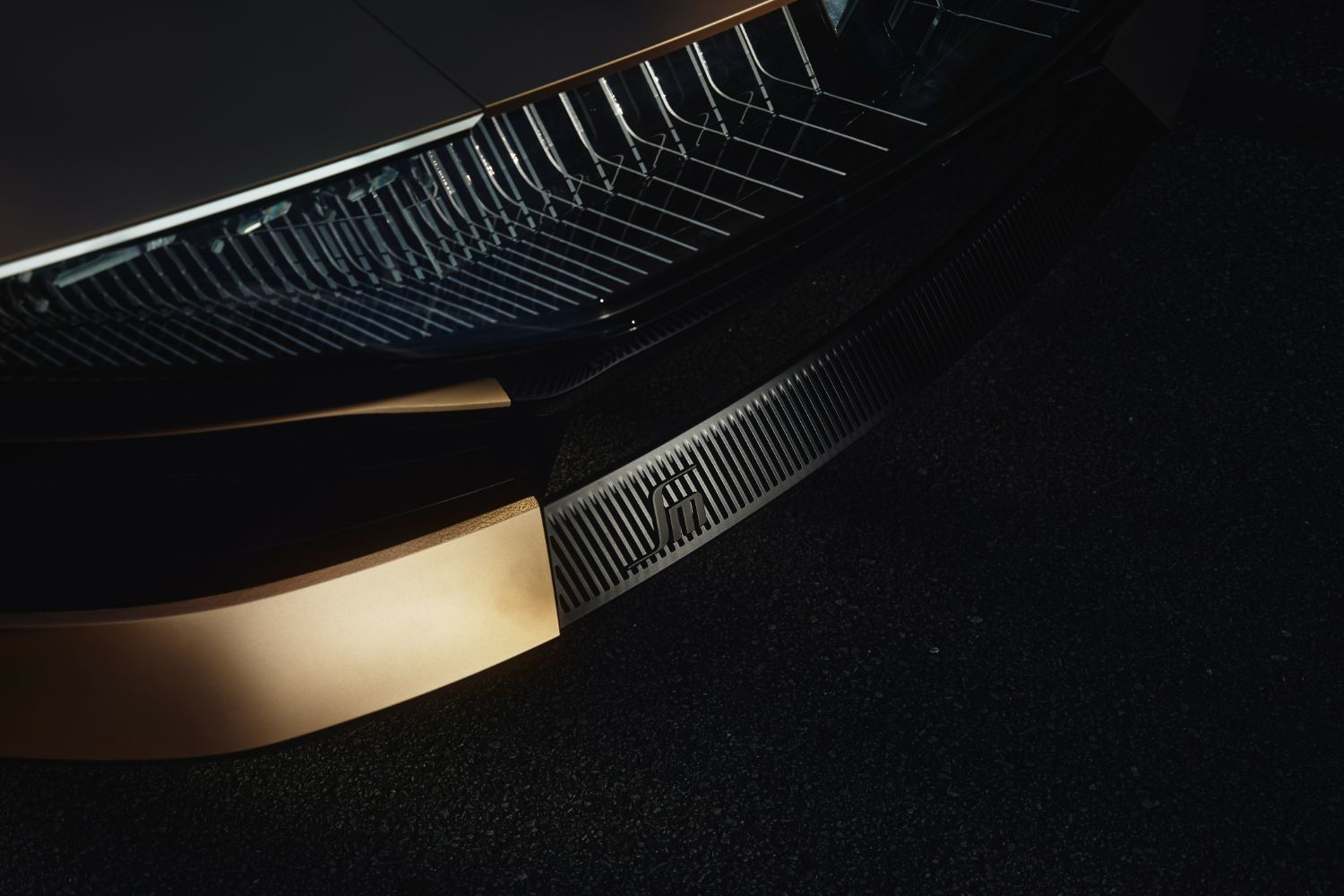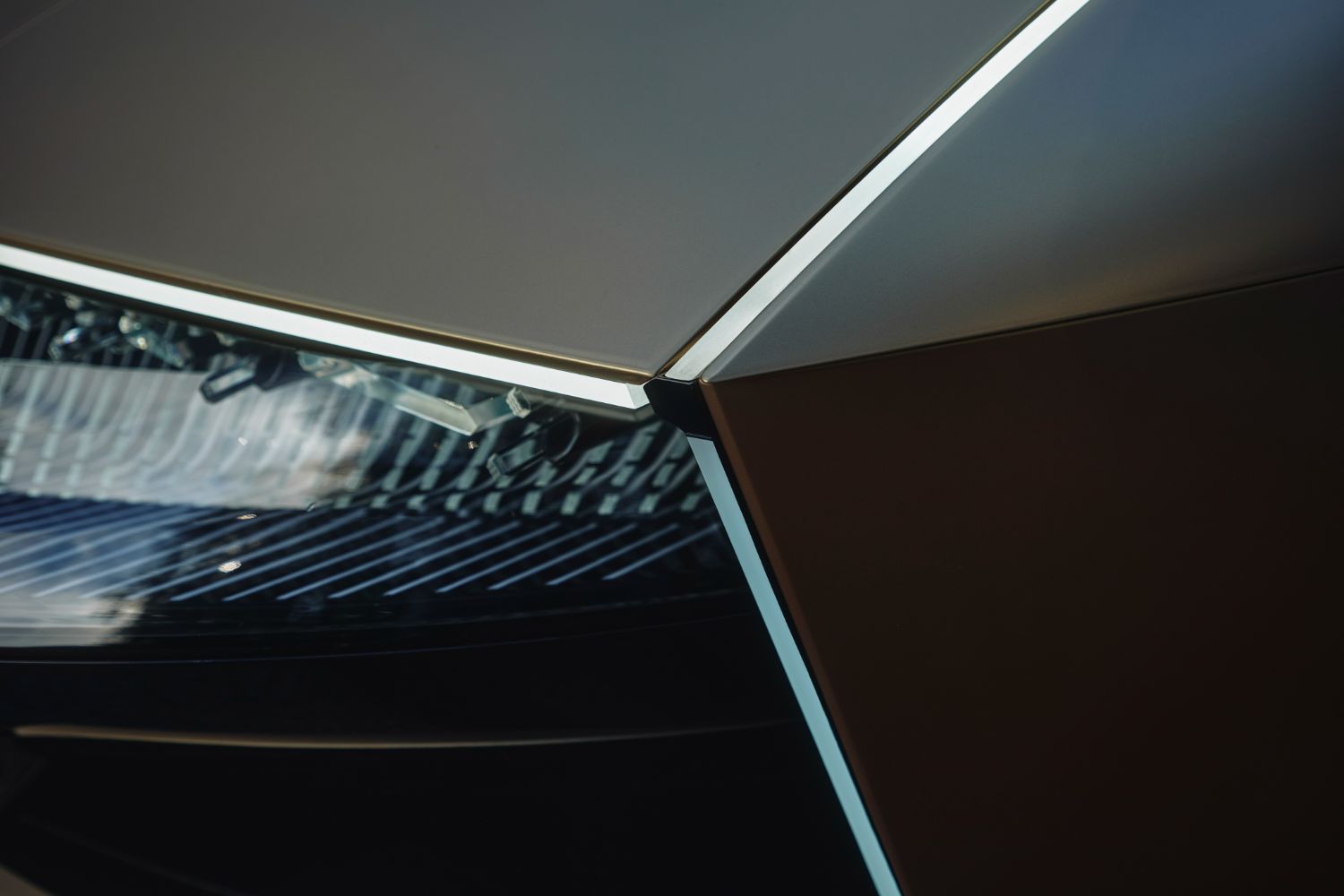 Where the original car had distinctive headlights behind a plexiglass panel, the SM Tribute has a 3D screen that lights up to its middle, framed by a light signature made up of three modules on each side - just like the original headlights - enhanced by eight diamond-tipped and vertical DRLs based on a triad shape meeting at a point like a ship's bow.