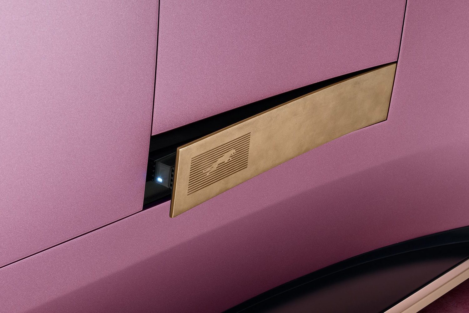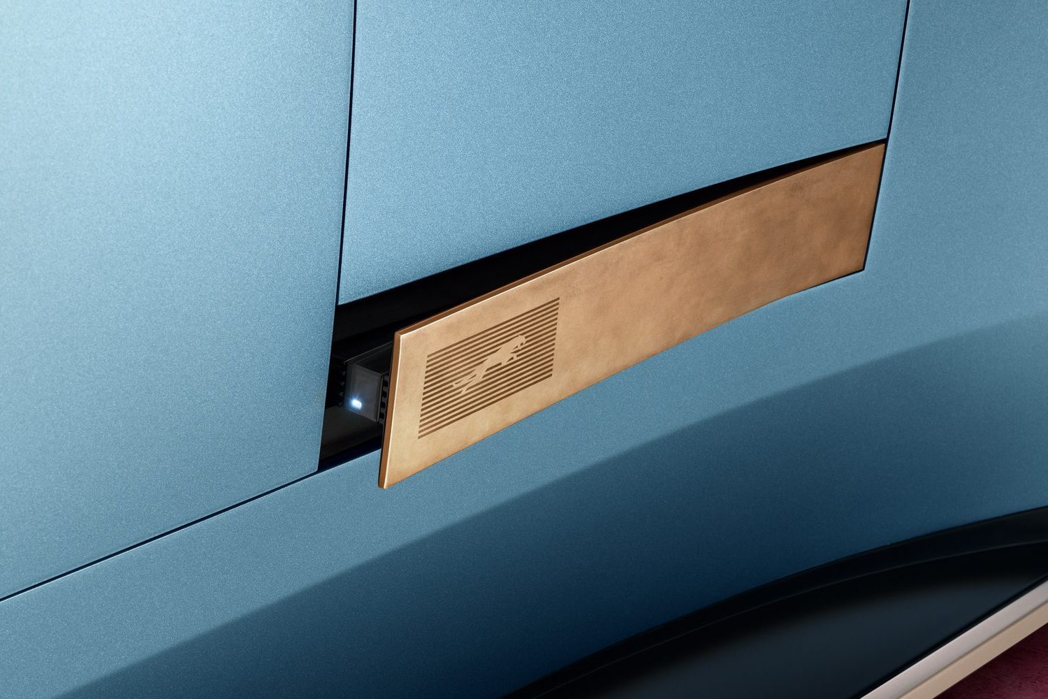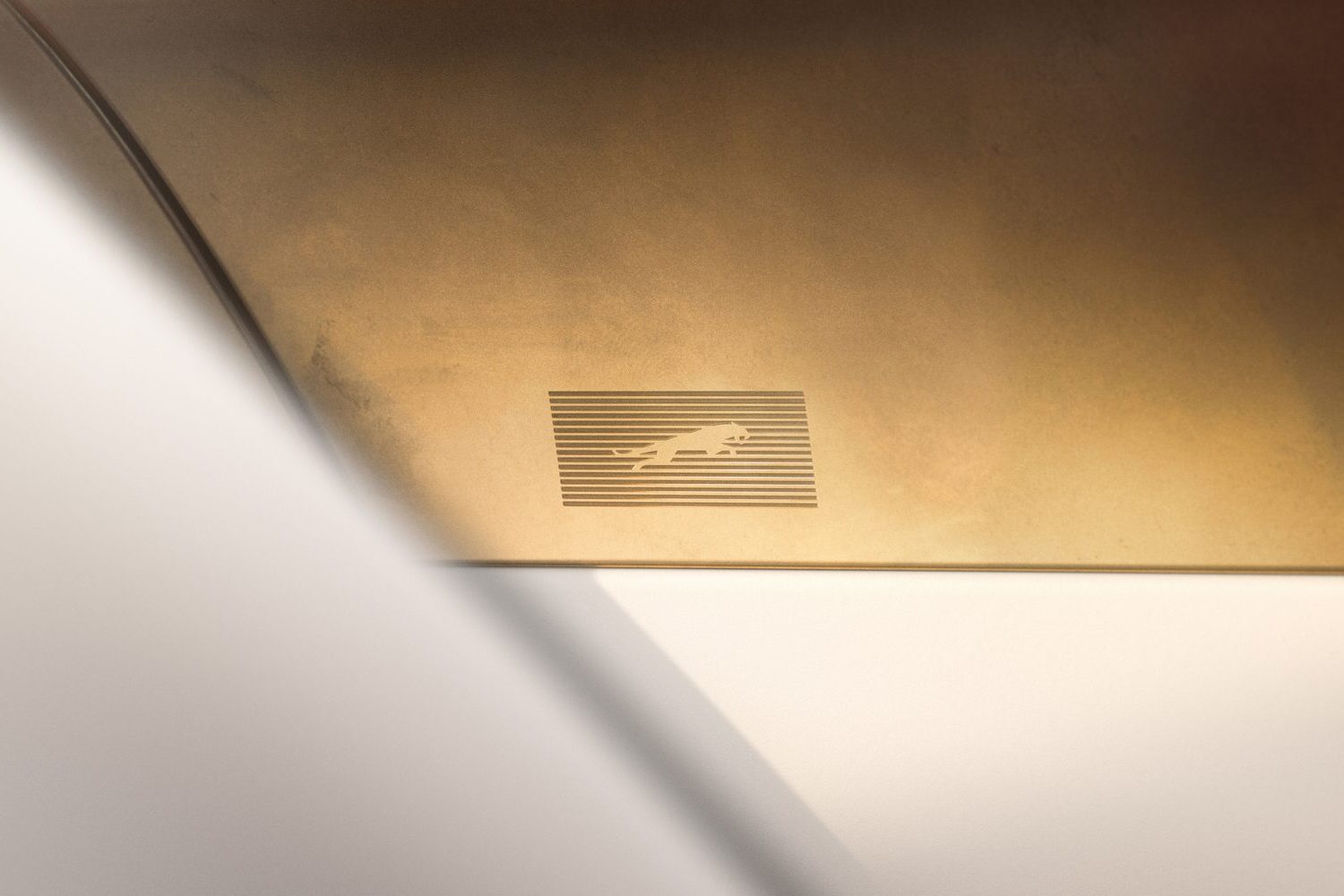 Ahead of the windscreen is more of that strikethrough graphic, which also delineates a storage compartment accessible from the side. The vertical lines visible from the car’s side profile do provide a subtle nod to the bonnet shut line of the Jaguar E-Type, while the brass ingot at the bottom pivots outwards for the rear-facing side camera to function when the car is running.