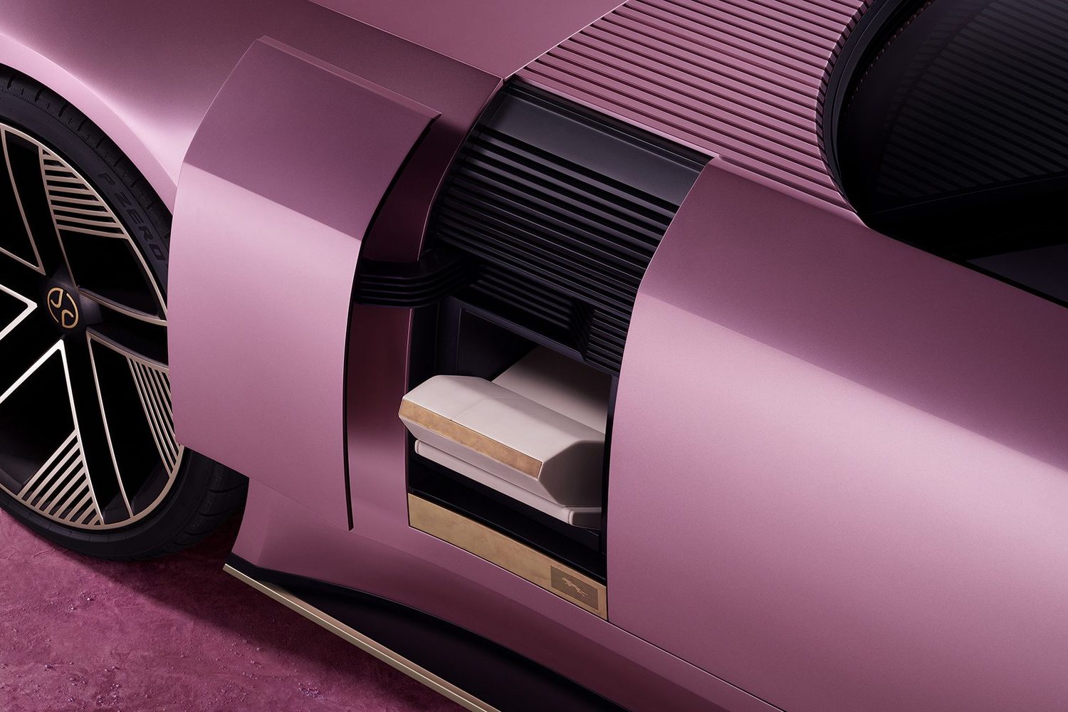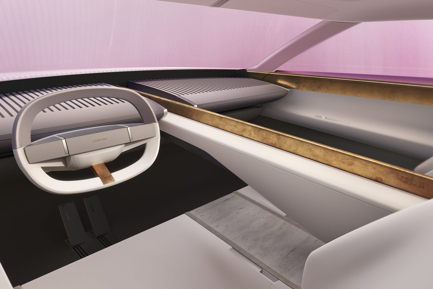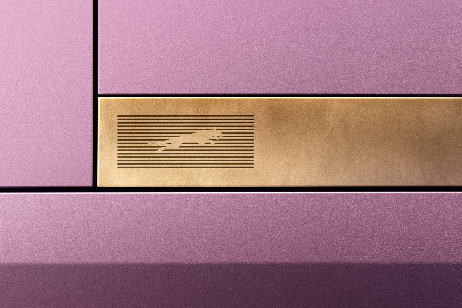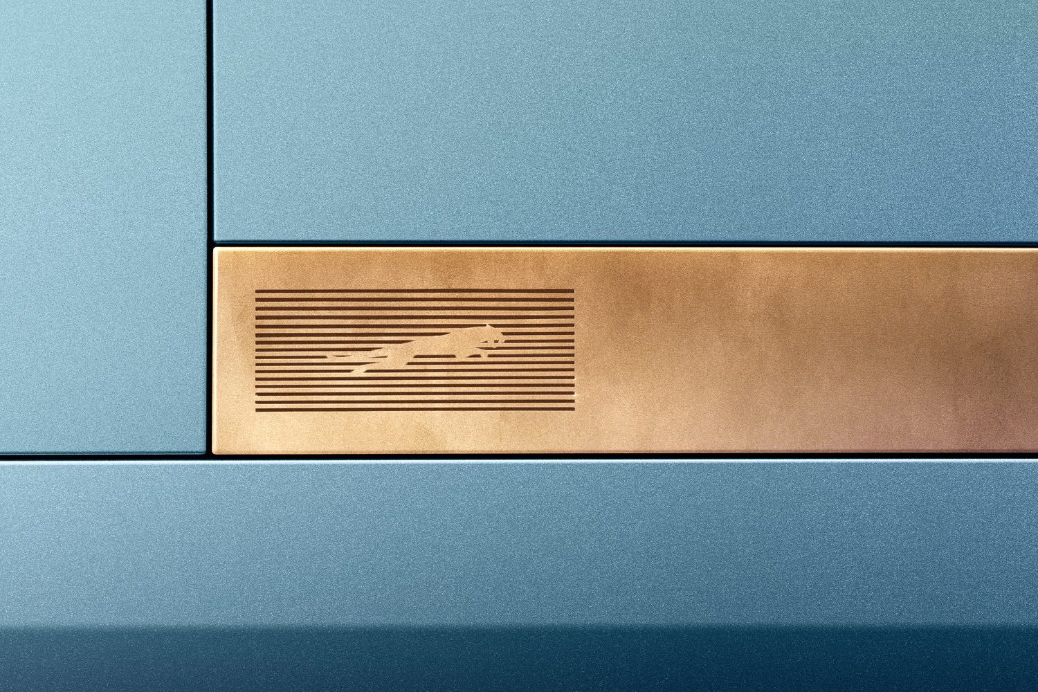 Ahead of the windscreen is more of that strikethrough graphic, which also delineates a storage compartment accessible from the side. The vertical lines visible from the car’s side profile do provide a subtle nod to the bonnet shut line of the Jaguar E-Type, while the brass ingot at the bottom pivots outwards for the rear-facing side camera to function when the car is running.