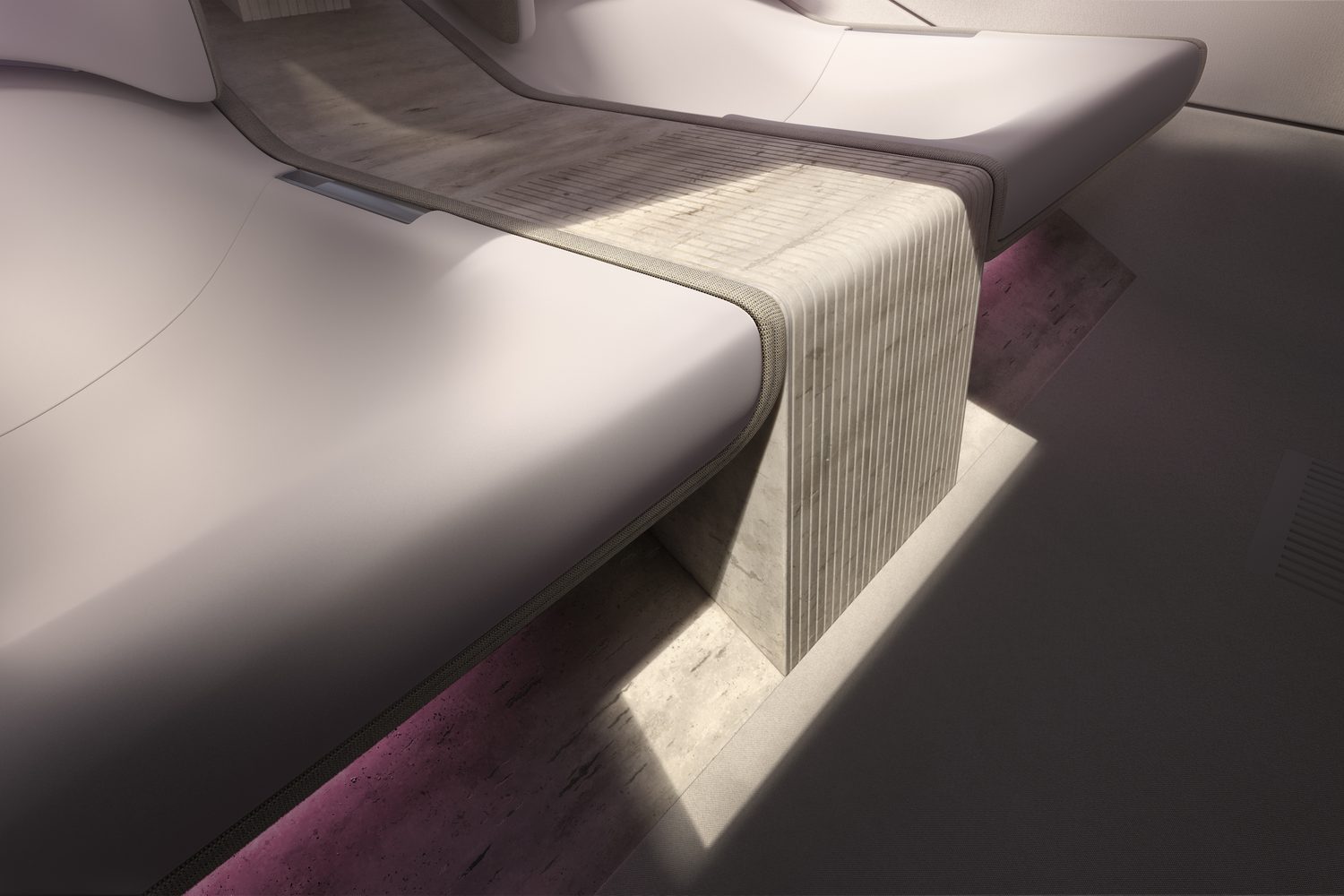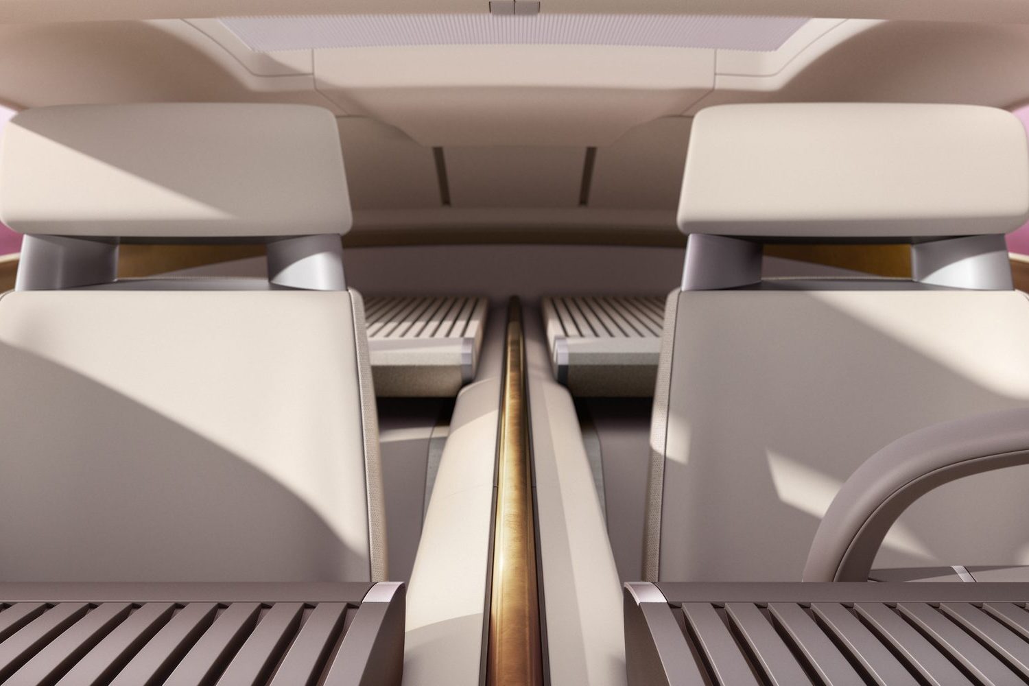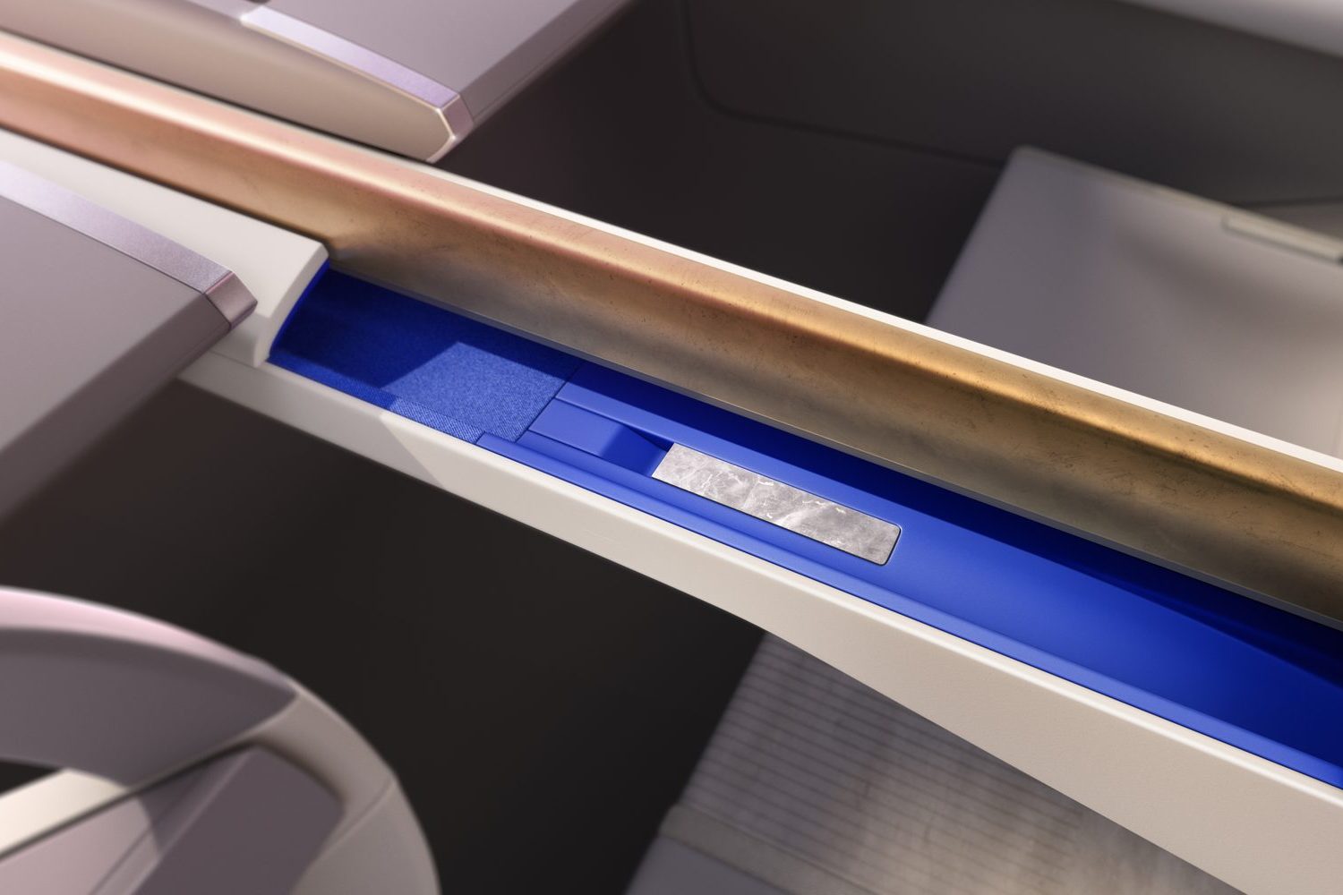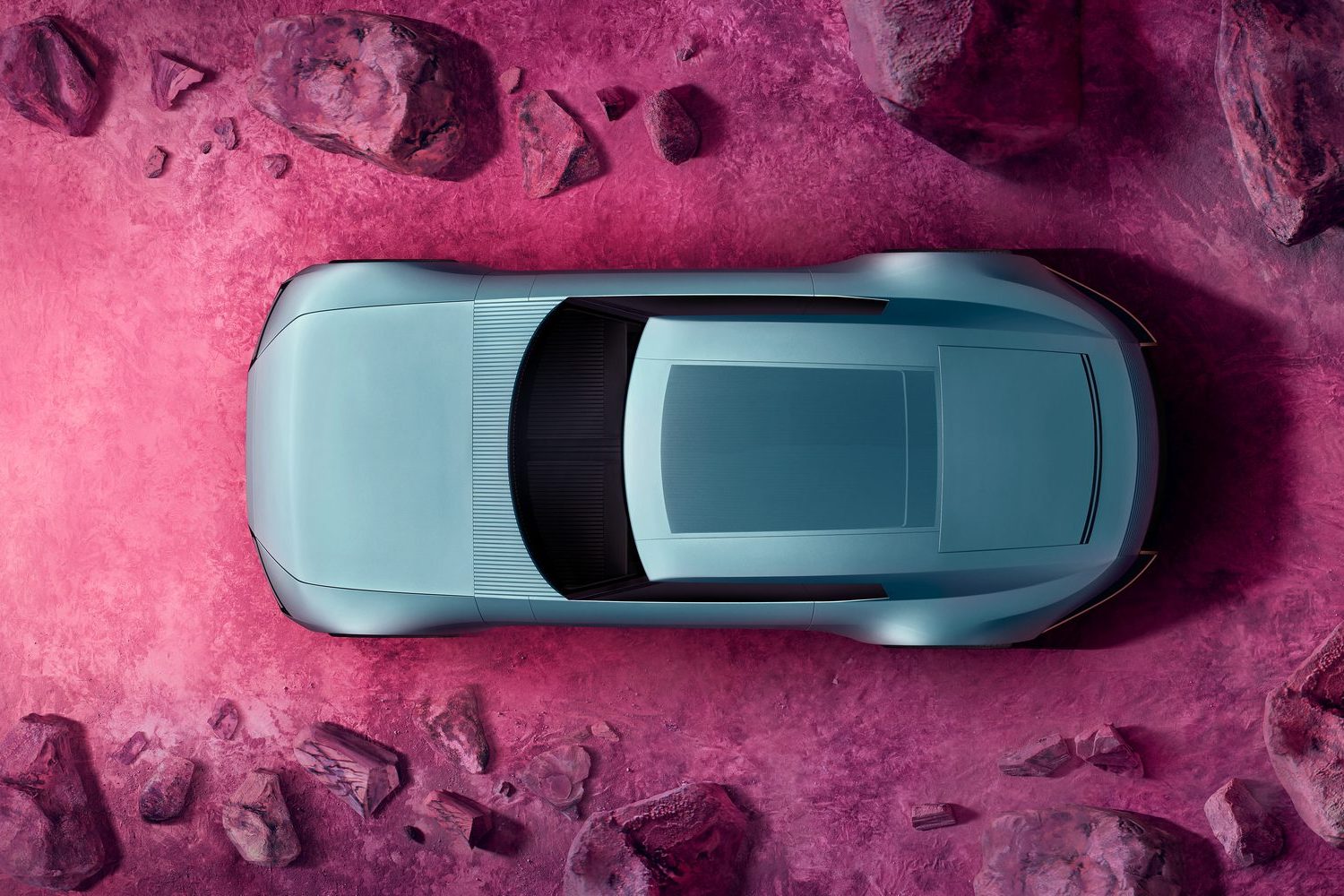 A thin digital display is placed at the end of the dashboard that repeats the strikethrough design. It wraps around the windscreen’s base, providing information to the driver and passenger in a condensed and simplified way. Two larger displays can pivot upwards from the dashboard to deliver a fully digital experience when needed.