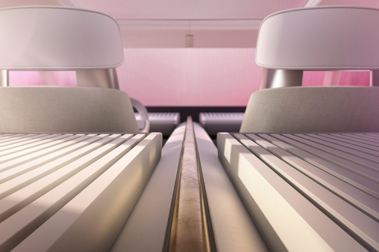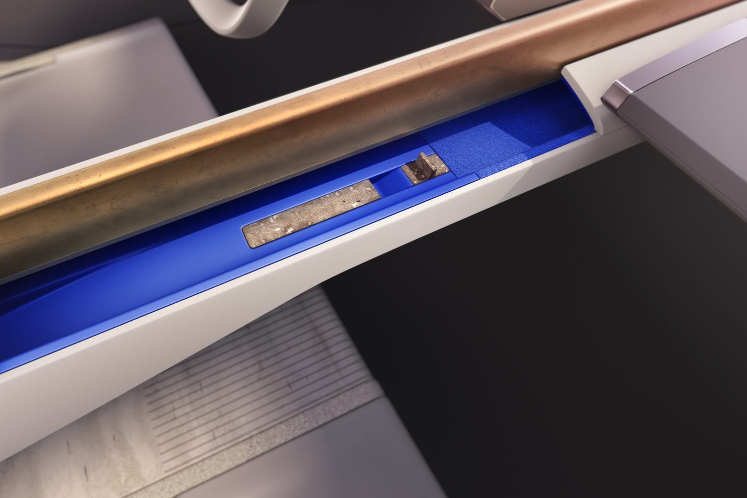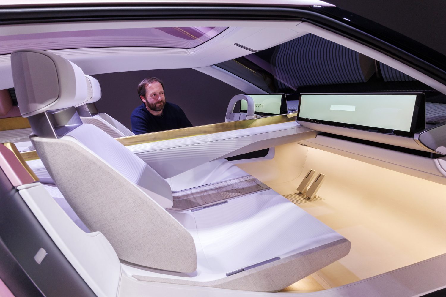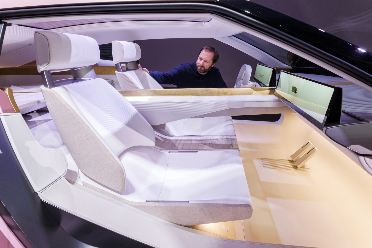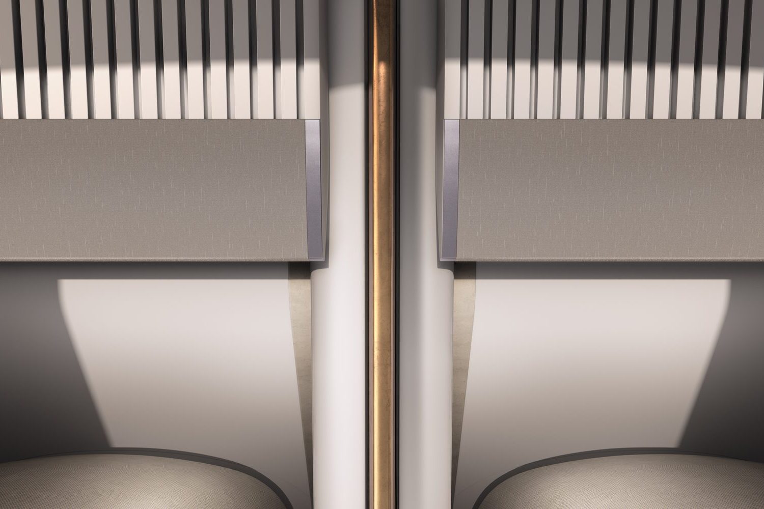 A thin digital display is placed at the end of the dashboard that repeats the strikethrough design. It wraps around the windscreen’s base, providing information to the driver and passenger in a condensed and simplified way. Two larger displays can pivot upwards from the dashboard to deliver a fully digital experience when needed.
