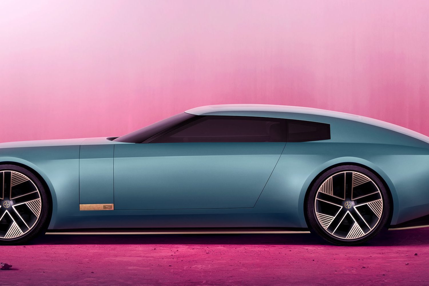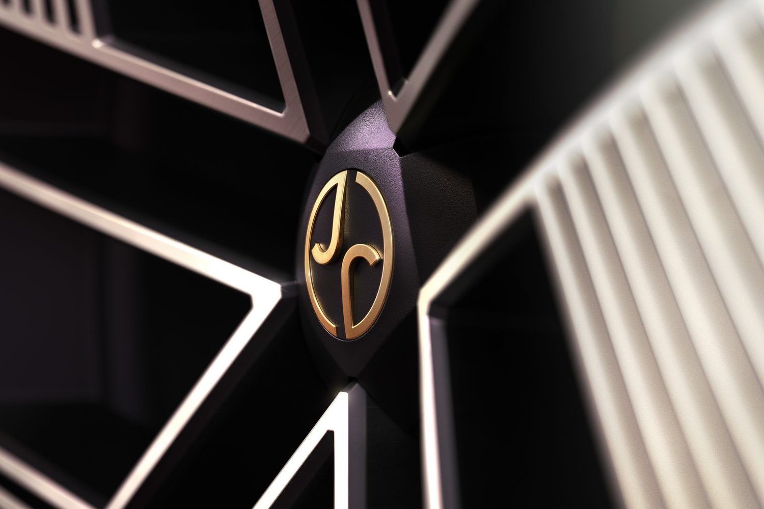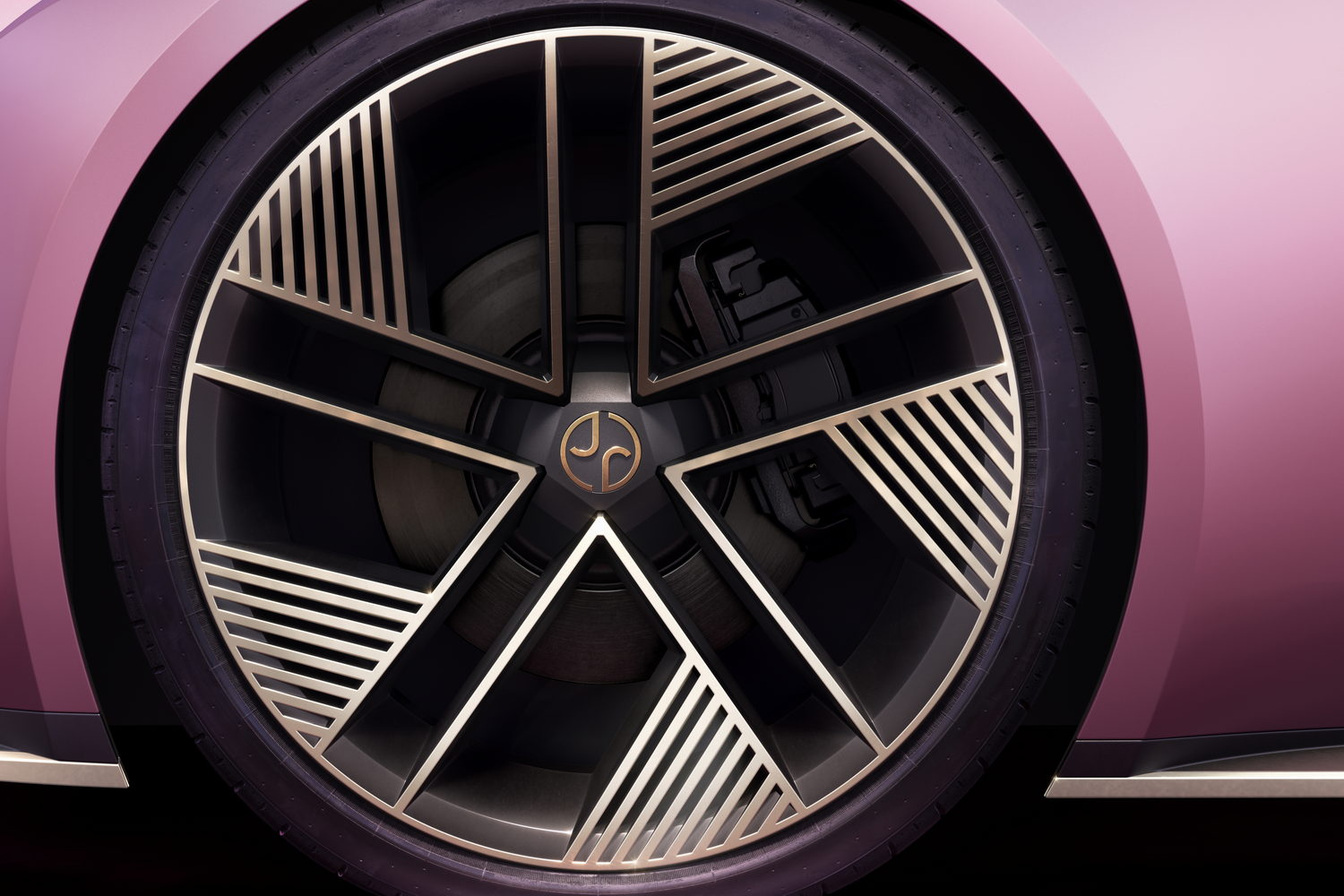 A raked windscreen flows elegantly into the roof and gently slopes rearwards to complete the fastback look. Narrow window apertures add to the Type 00’s exaggerated styling and stop ahead of the rear axle line. Its vast 23-inch wheels, containing the abbreviated ‘J R’ device mark on their centre caps, repeat design cues on the car and illustrate its overall size.