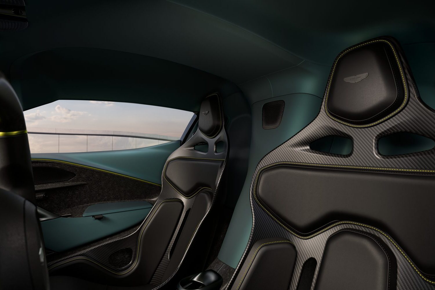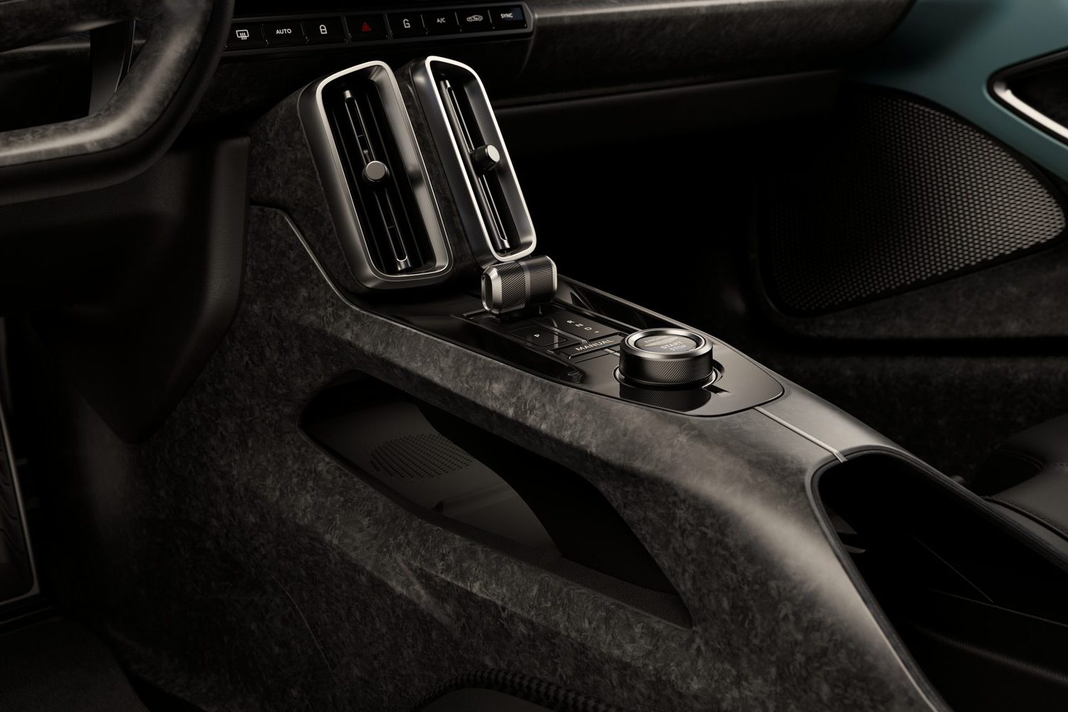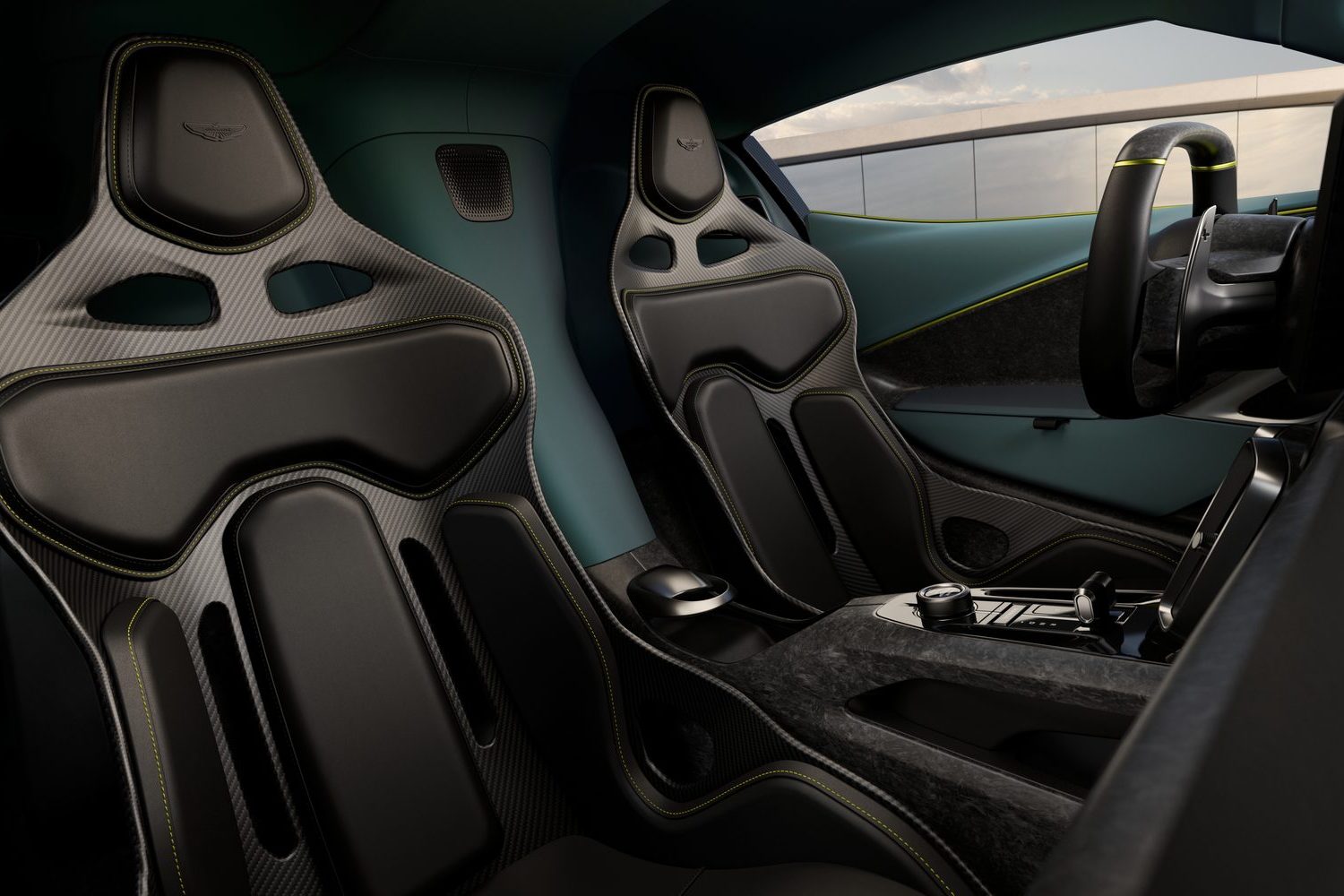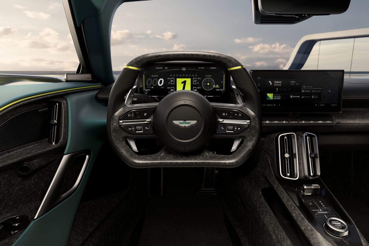 That entirely depends on how you specify your Valhalla, as the sky is the limit as ever with Aston Martin when it comes to personalisation. Saying that, we doubt the core driving position is up for discussion, as the feet are raised up just as in an F1 car, while the two seats are one-piece carbon-fibre items. The extremely flat steering wheel clearly references motorsport as well, and the Valhalla has unique digital instrumentation behind, along with long solid gearchange paddles. The rest of the interior is quite minimal in appearance, making much use of carbon fibre, and it appears beautifully made. Eagle-eyed readers will spot the tactile drive and mode selectors in between the front seats that made their debut on the Aston Martin DB12 last year, and there’s a fully functional touchscreen infotainment system as well.