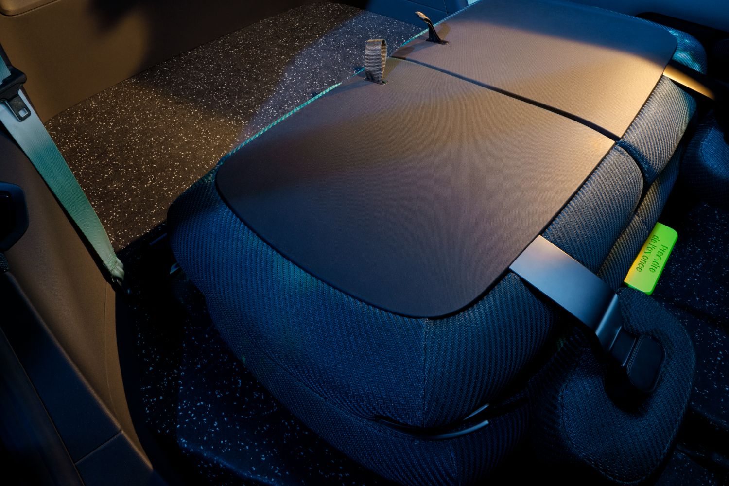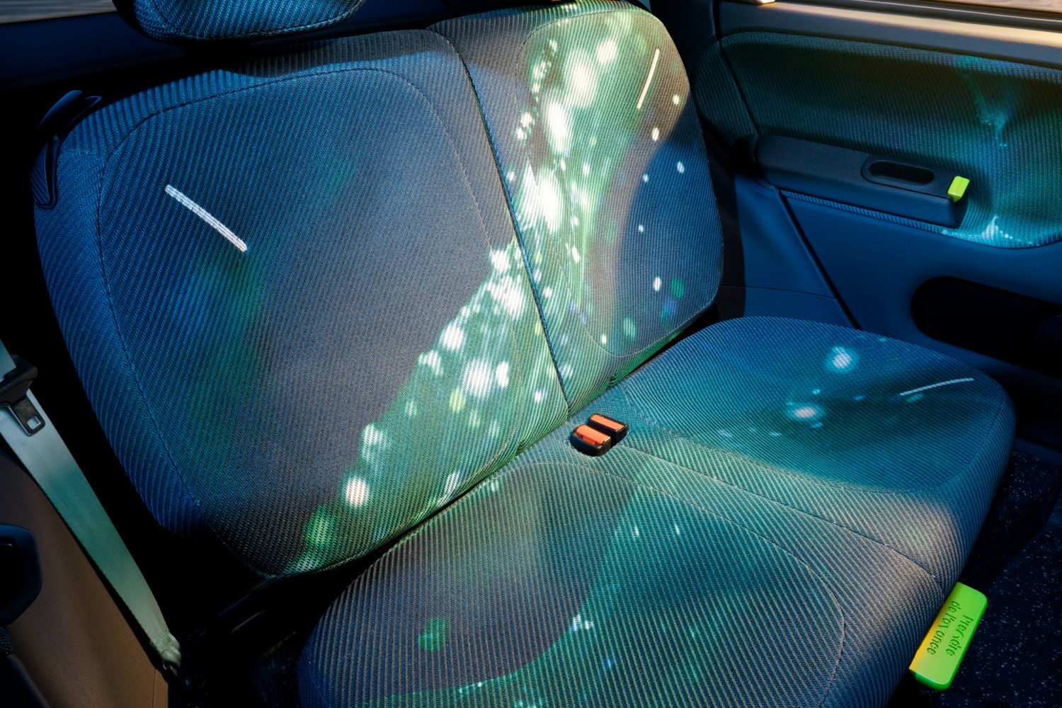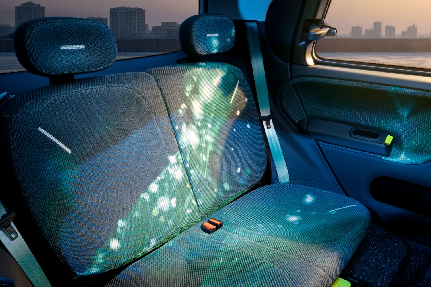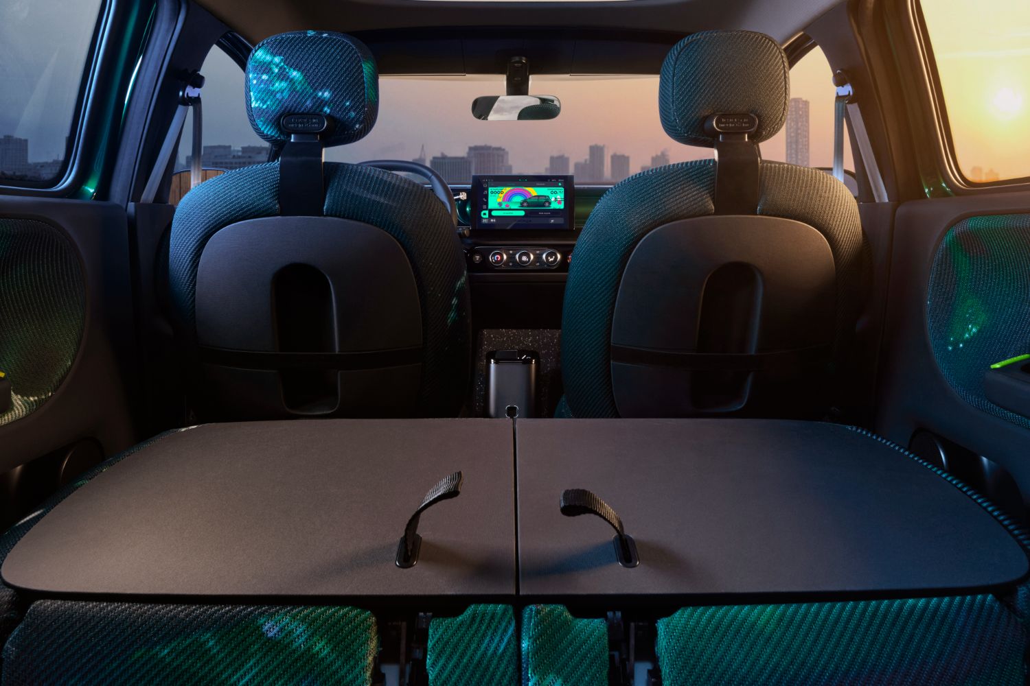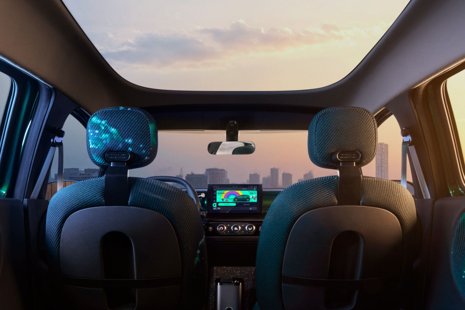 Practicality is enhanced in other ways, such as the 50/50 split-folding rear bench having the ability to slide backwards and forwards, maximising either passenger or boot space accordingly. There are even clever touches like a magnetic area in the front head restraint which allows rear passengers to hold their phones in place, or an elastic strap that doubles as both a map pocket or something that’ll keep a water bottle easily to hand. Yet the fun details continue, with the seatback adjustment knob designed to look like the wheel of a skateboard, or the fact that the designers have left little messages dotted around the cabin for passengers to find. And all of this is bathed in light, because the Twingo E-Tech has a rounded, glass roof.